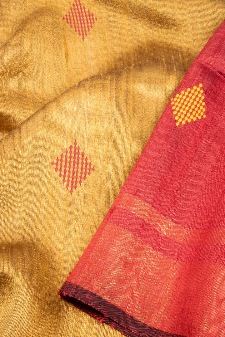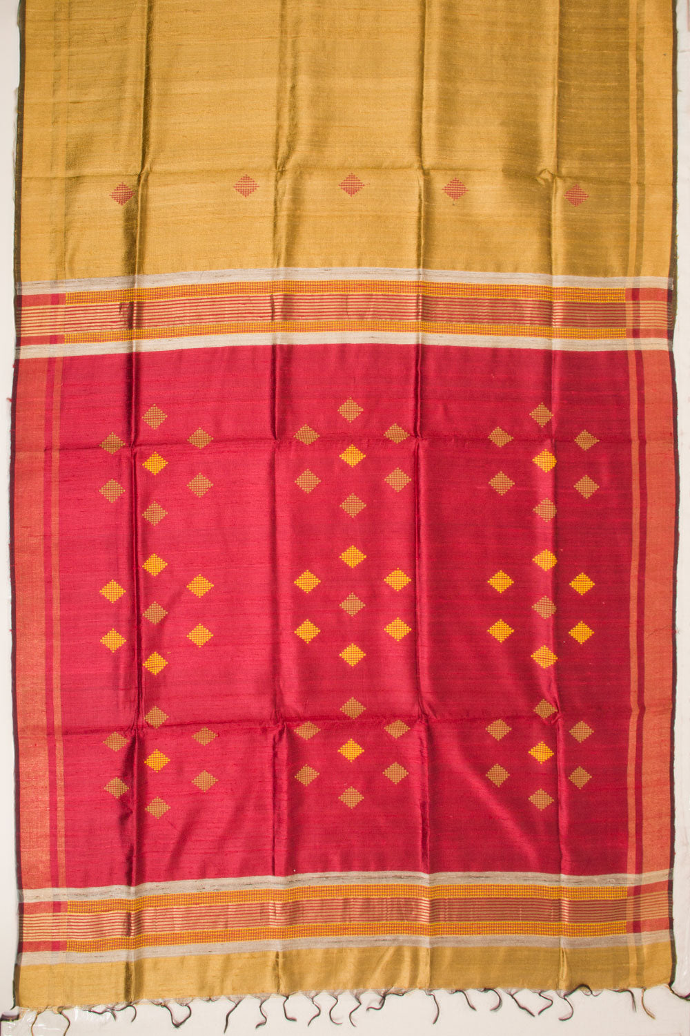 Indulge in the sophistication of the Brown Handloom Bhagalpur Dupion Tussar Silk Saree. Featuring the intricate Bhagalpur weaving method, this saree is skillfully made with opulent Dupion and Tussar silk, embellished with graceful geometric designs and a captivating Jhamdani weave on the pallu. Pair it with the complementary colored blouse for a truly stunning appearance.