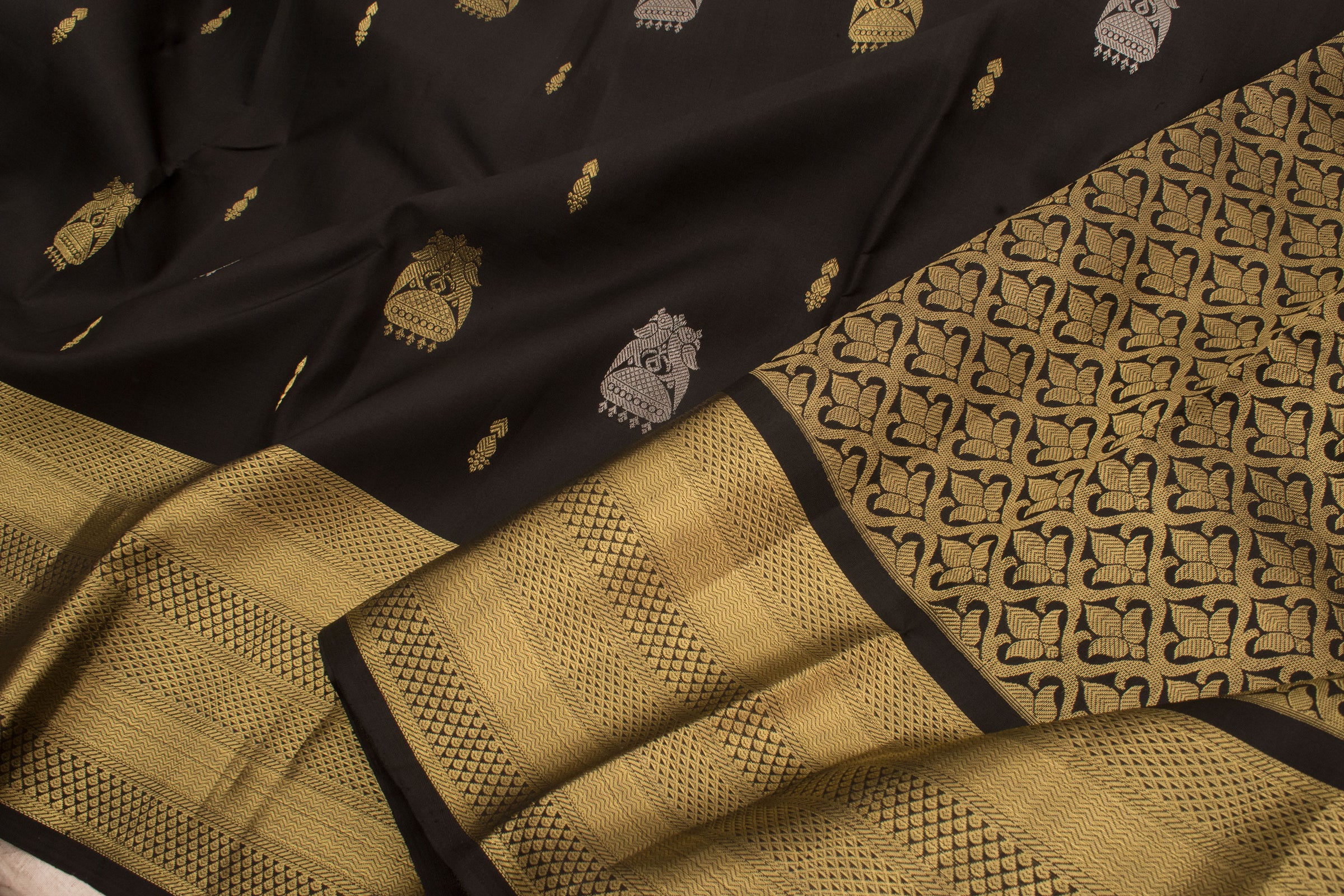 This Stylish Black Handloom Pure Zari Kanjivaram Silk Saree has bands of Black Silk and Threadwork across the body. Broader bands of zari adorn the black pallu and the saree comes with a black blouse