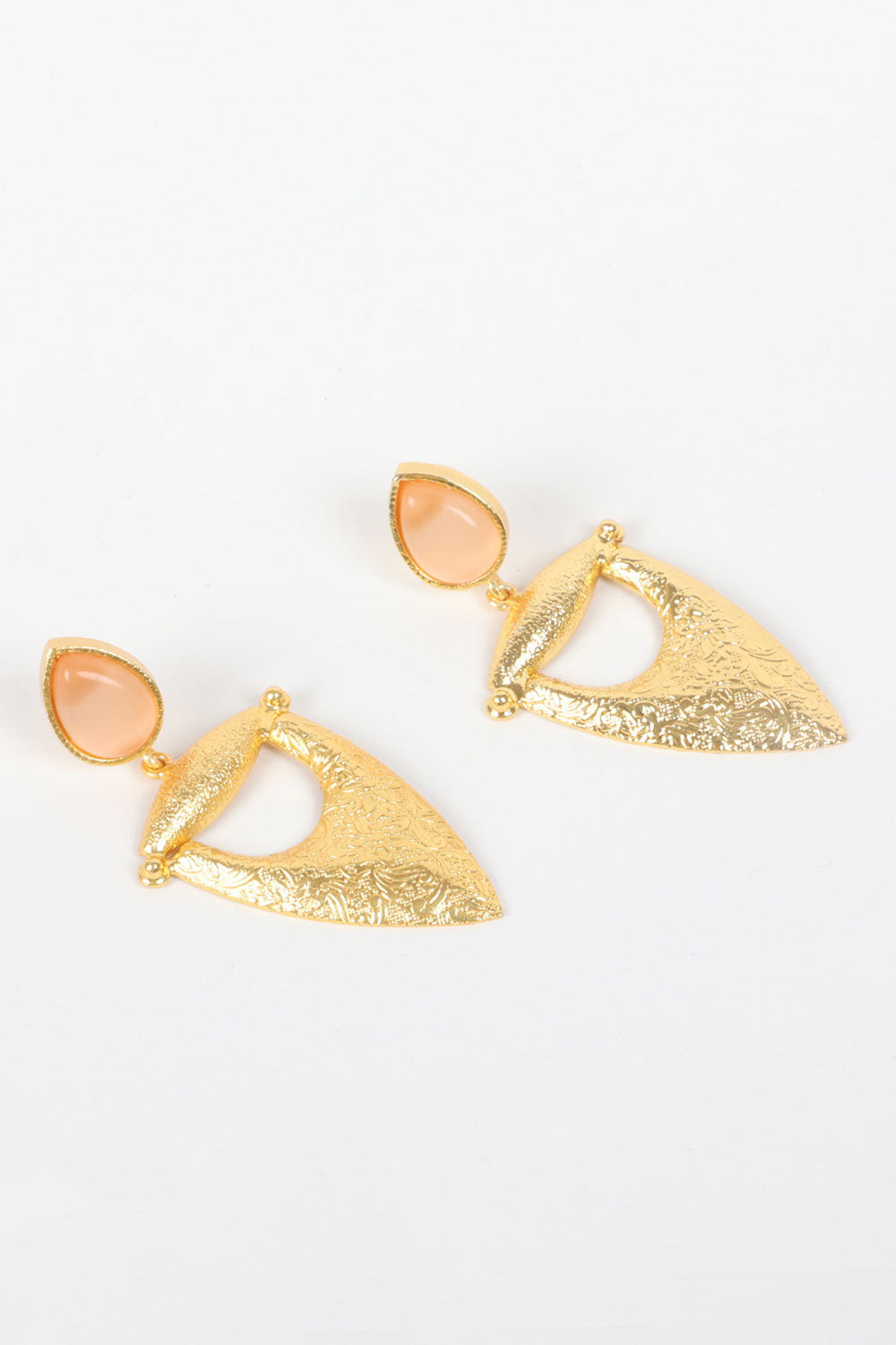 Handcrafted Gold Tone Brass Drop Earrings with Peach Cutstone Stud 10061358