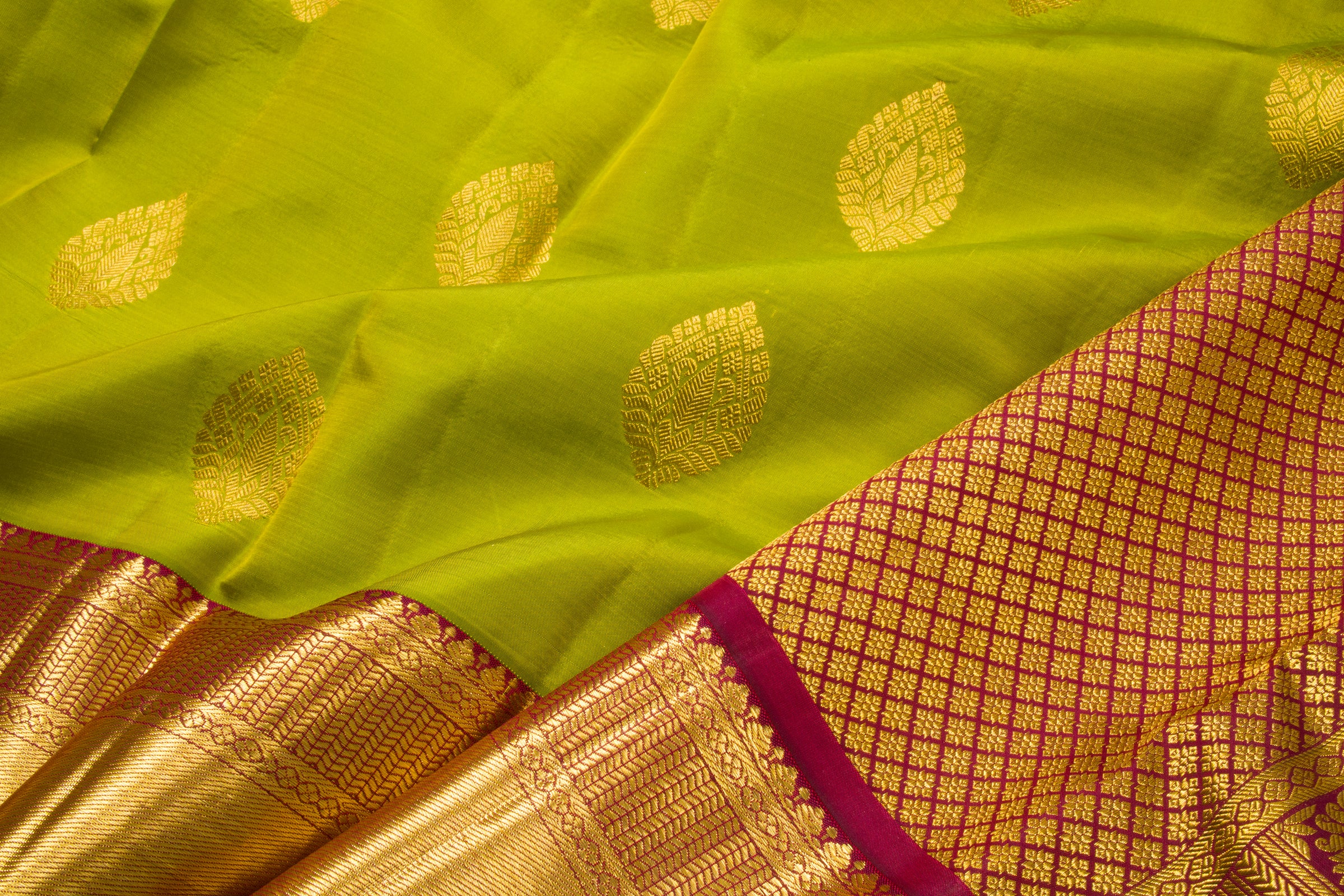 This Pista Green Pure Zari Kanjivaram Silk Saree is perfect for brides looking for a pastel saree. With its handloom Kanjivaram silk construction, this saree contains a Kodi Mango design in Zari on the body and a Vanki design a...