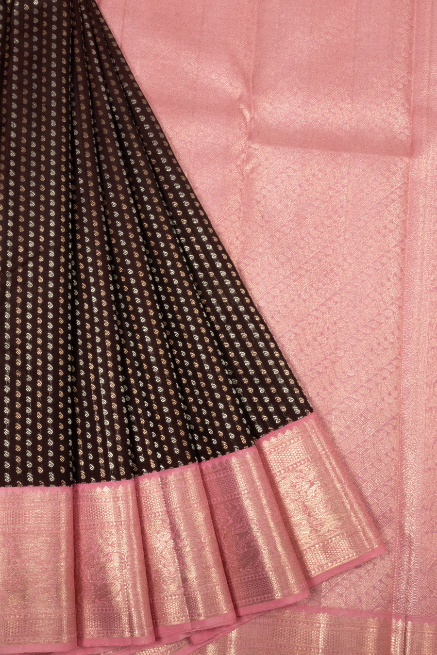 This Black Handloom Kanjivaram Silk Saree is expertly crafted with a classic checks design all over the body and featuring a geometric band and alternating stripes in silver zari on the pallu. Its timeless design and premium si...