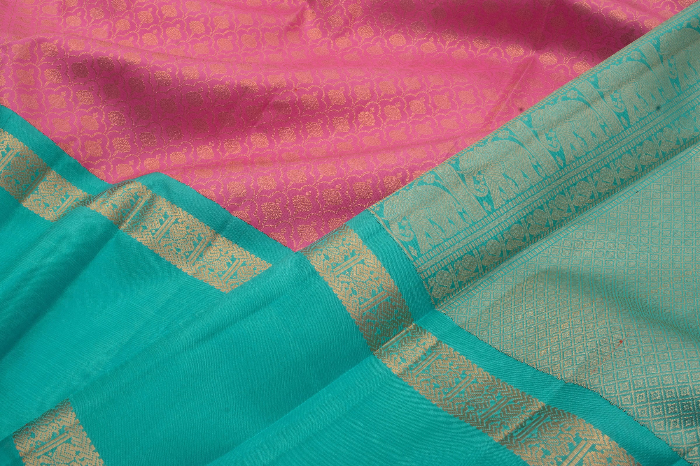 This breathtaking Pink Pure Zari Kanjivaram Silk Saree is handloomed with delicate, floral buttis throughout the body. The striking Teal Korvai Border showcases a mesmerizing Thandavalam Design with exquisite Peacock Motifs. Th...