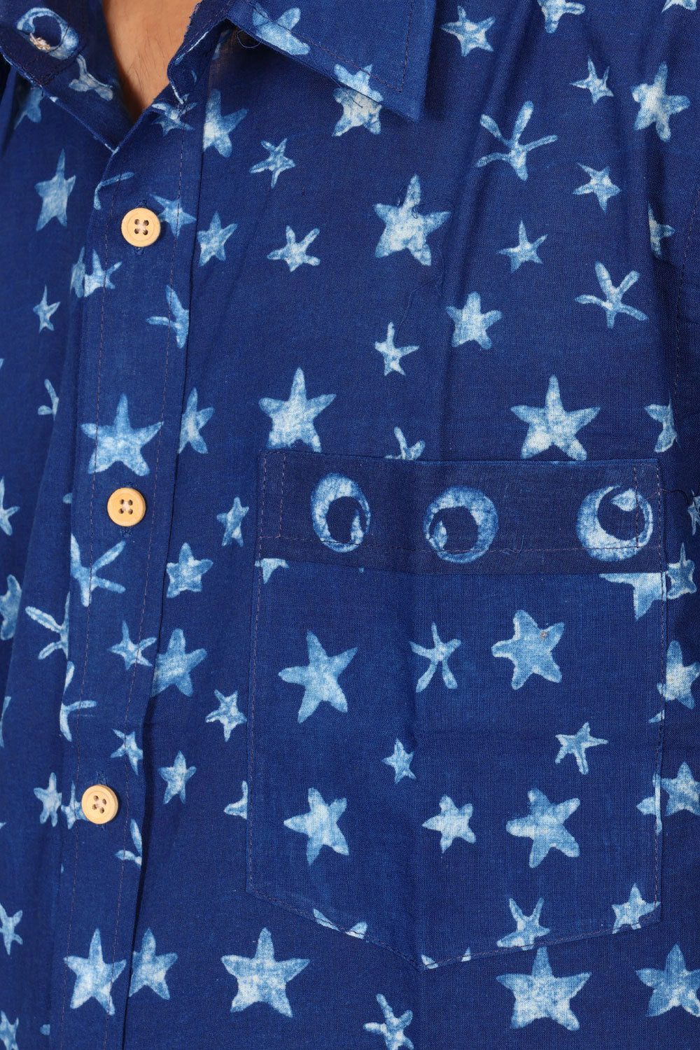 This Indigo Handblock Print shirt, made from pre-washed pure cotton, features wooden buttons and convenient pockets. Its versatile design pairs perfectly with jeans, khaki pants, or shorts, making it an essential addition to yo...