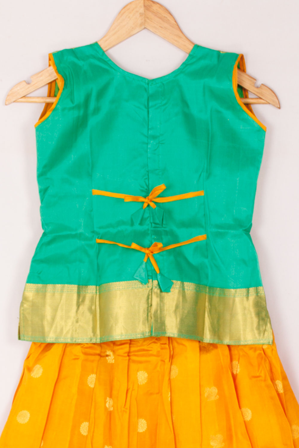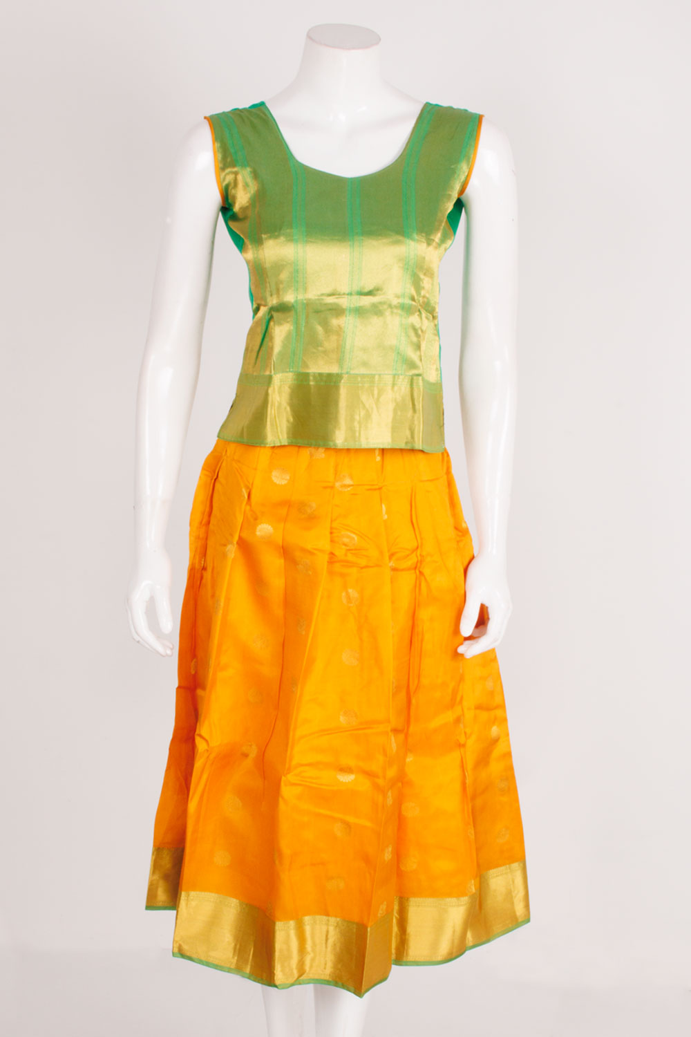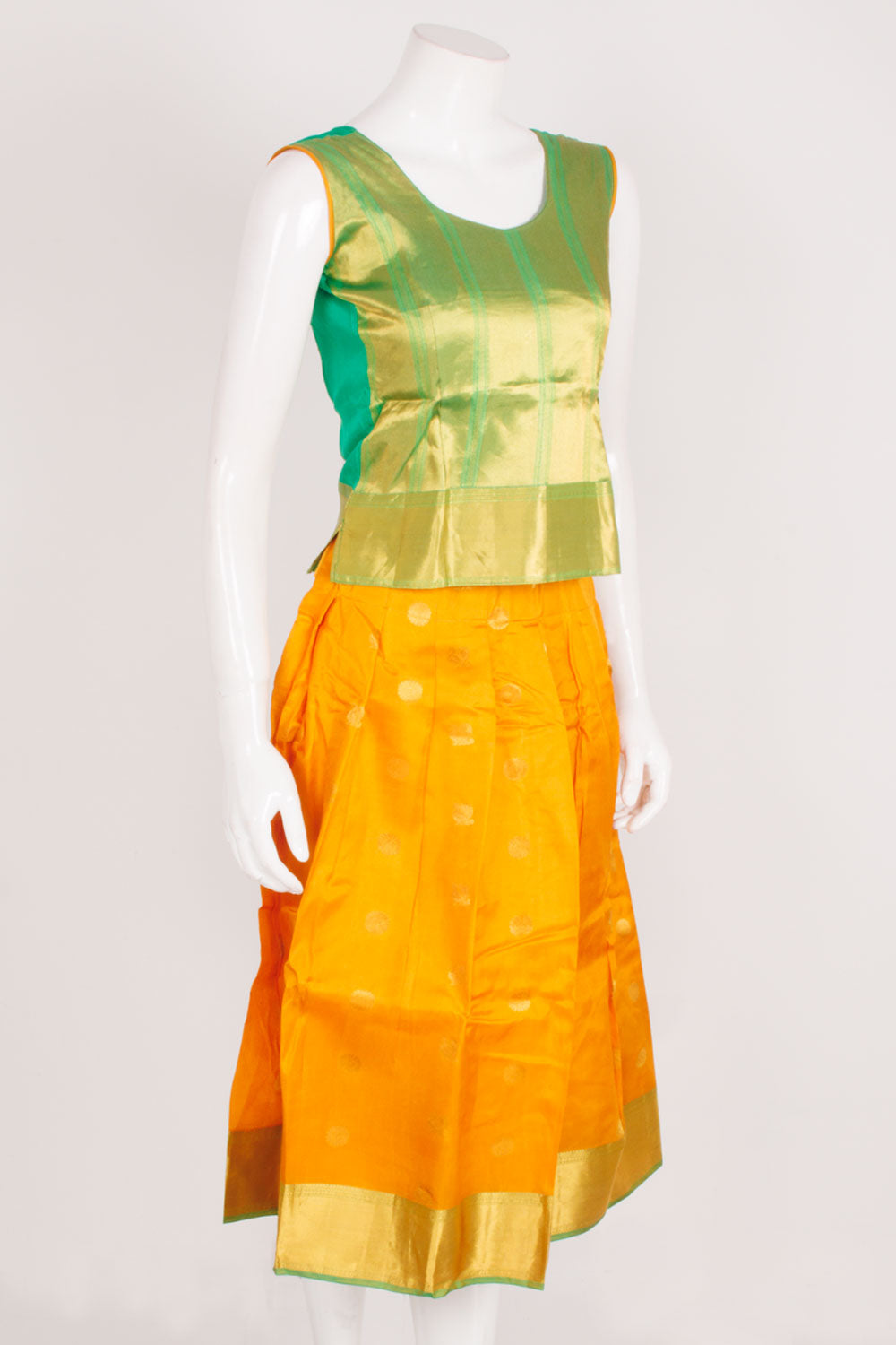 - All measurements mentioned are garment measurements. Measurement could vary upto 10%. This Pavadai comes with a Detached Sleeve. The Pavadai & Top have Cotton Lining The Pavadais are individually handcrafted and made from Handloom Material. Therefore there will be piece to piece minor variations in the design. Also the Colour and design of the Back and Sleeve may change.