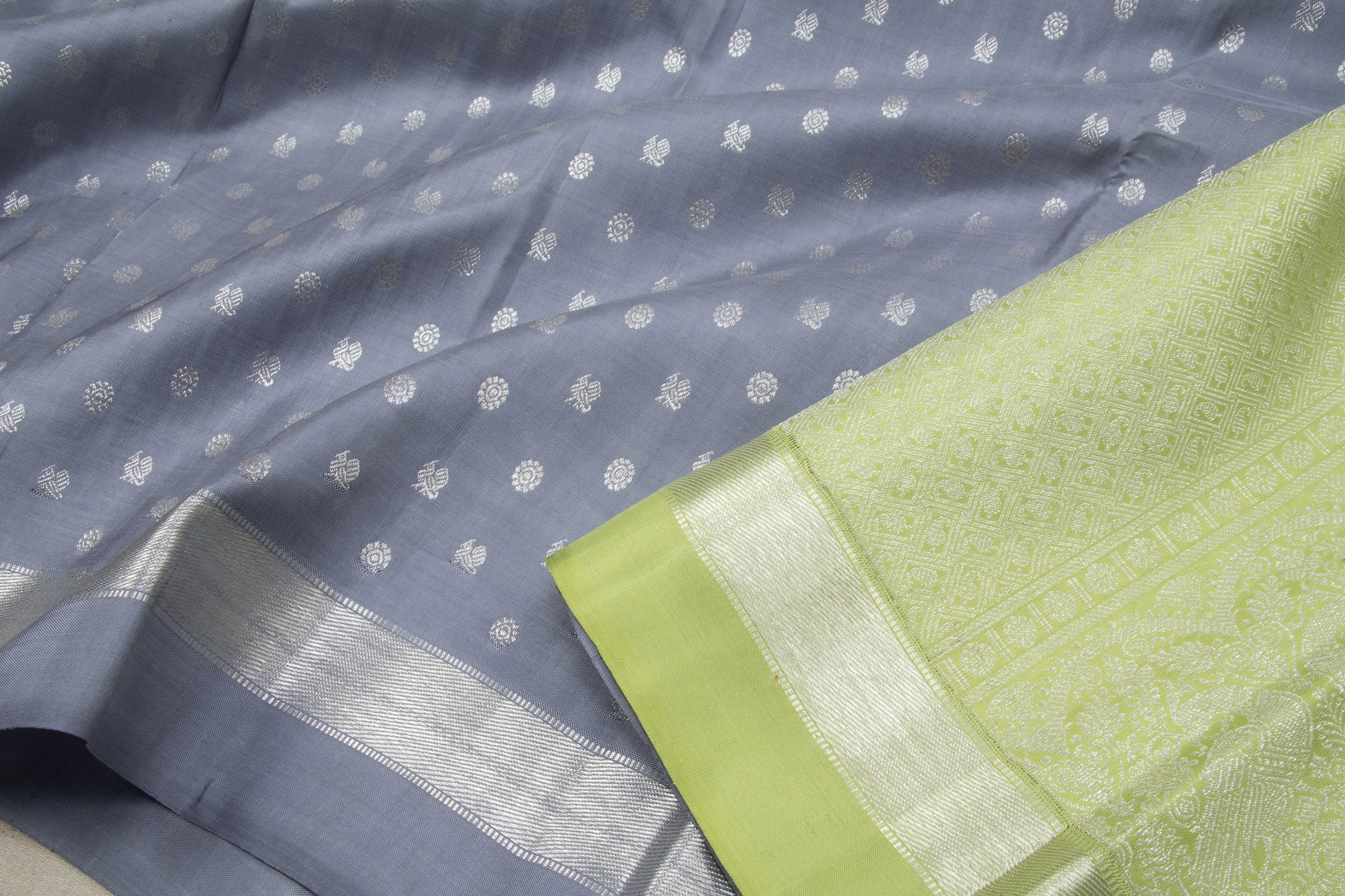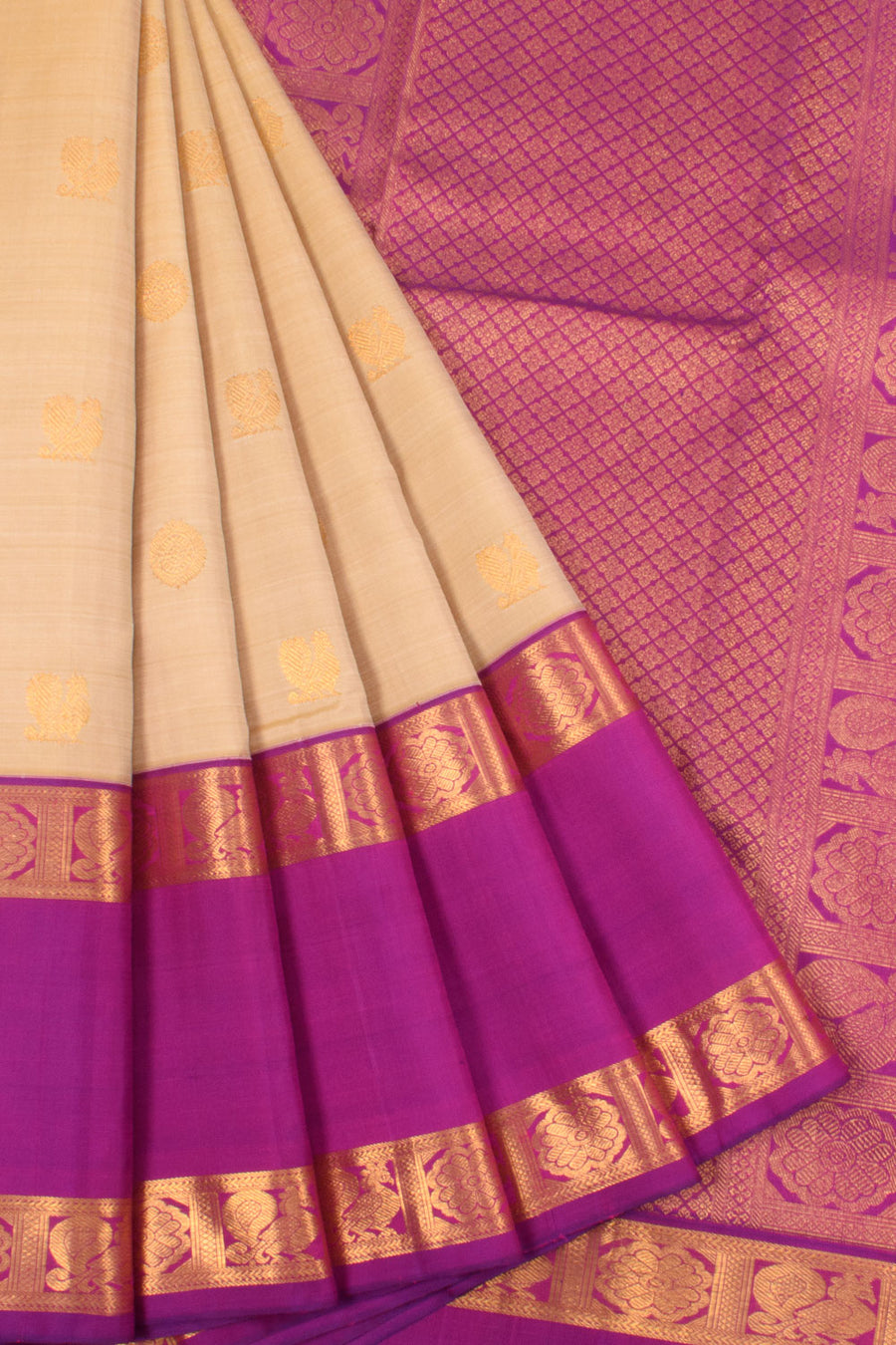 This Gorgeous Violet Handloom Kanjivaram Silk Saree features Mayil Chakaram Motifs decorating the body. The border and pallu display stunning floral motifs and diamond patterns. A Contrasting grey blouse adds the perfect finish...