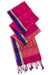 Bright and beautiful, this Magenta Handloom Soft Silk Kanjivaram Saree flaunts a chic narrow Dark Blue Border. The body is sprinkled with playful floral motifs, while the Magenta pallu shines with golden fern designs. Top it off with a contrasting Dark Blue blouse for a fun, eye-catching twist!