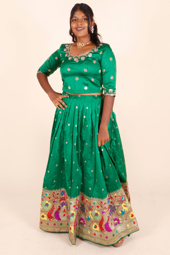 Elevate your style with our Green Handcrafted Paithani Lehenga. Expertly crafted by hand, this elegant lehenga features a timeless Green color that exudes sophistication and grace. Perfect for any special occasion, this piece will make you stand out and feel confident in its impeccable design and quality. Embrace the beauty and tradition of Paithani with this stunning lehenga.