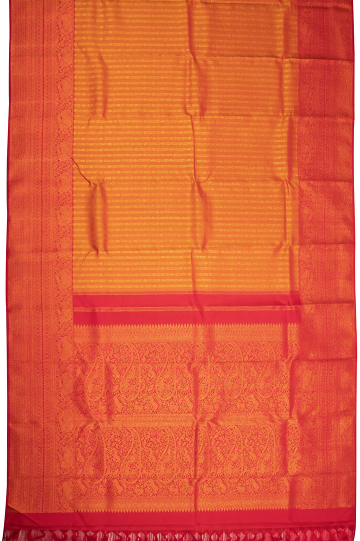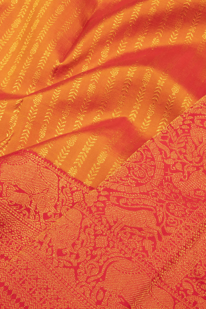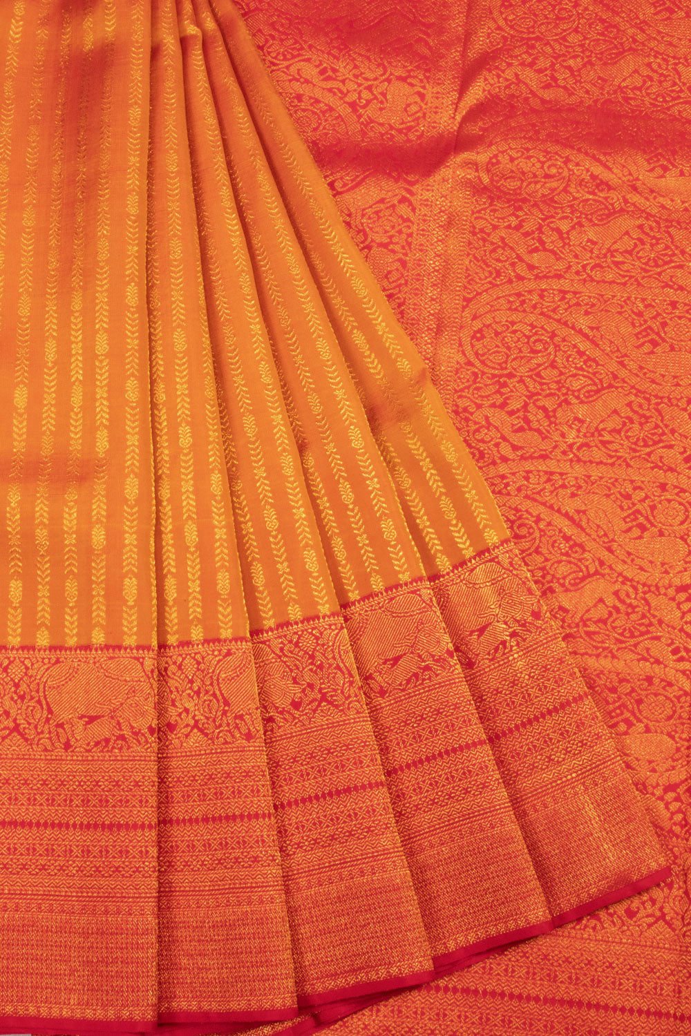 Celebrate your special day with the vibrant Orange Handloom Bridal Korvai Kanjivaram Silk Saree. Handwoven using traditional Korvai techniques, this saree features a radiant orange hue that symbolizes joy and festivity. Crafted from premium silk, it combines rich texture with lasting durability, making it the perfect choice to create an unforgettable bridal look filled with elegance and warmth.