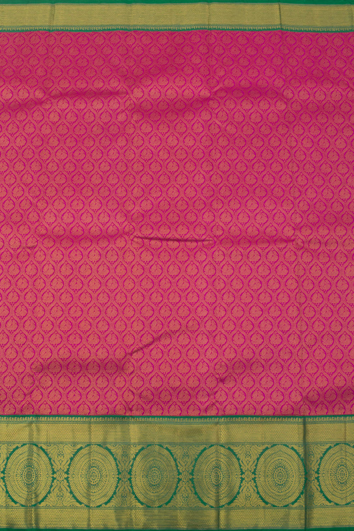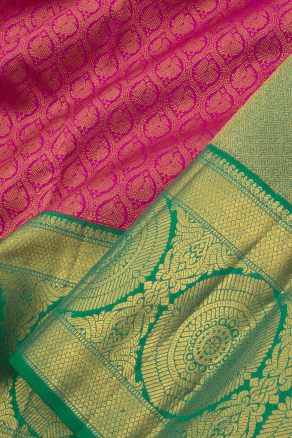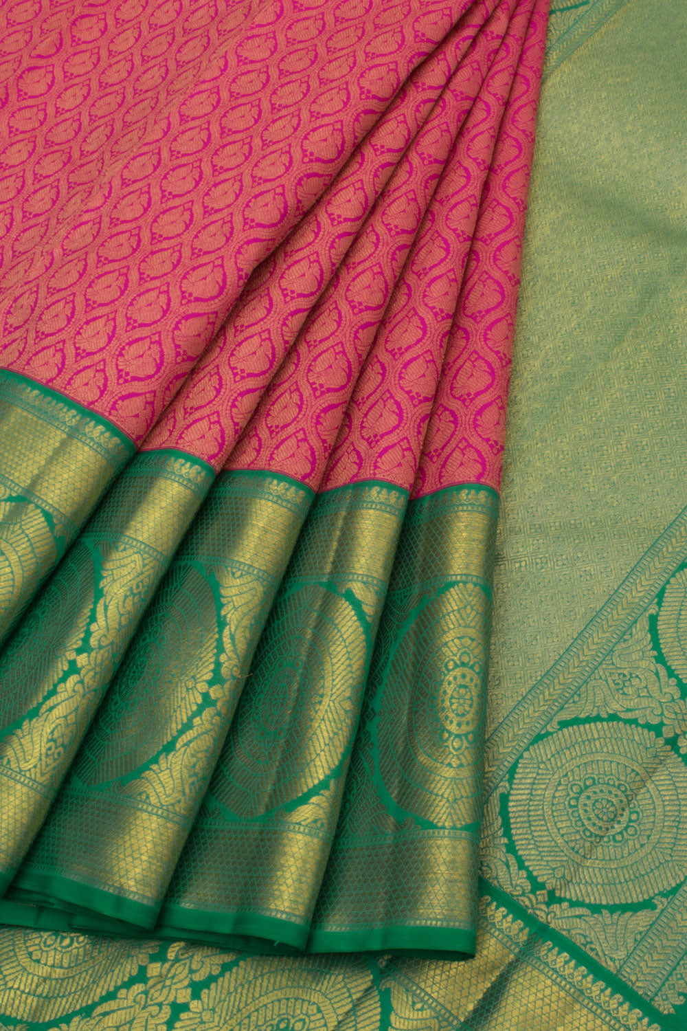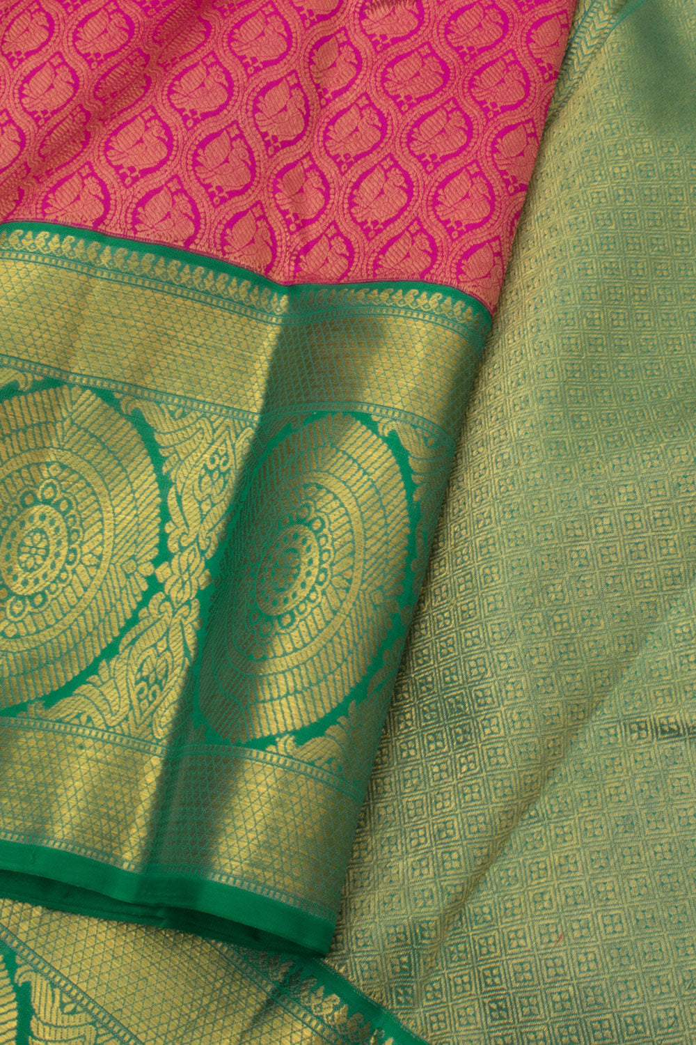 This Exquisite Pink Pure Zari Handloom Bridal Korvai Kanjivaram Silk Saree features Beautiful Peacock Designs throughout. The Dark Green Border provides a Striking Contrast with its intricate Floral and Chakaram Motifs. The same Floral Design is carried into the pallu, and a complementary blouse adds the finishing touch.
