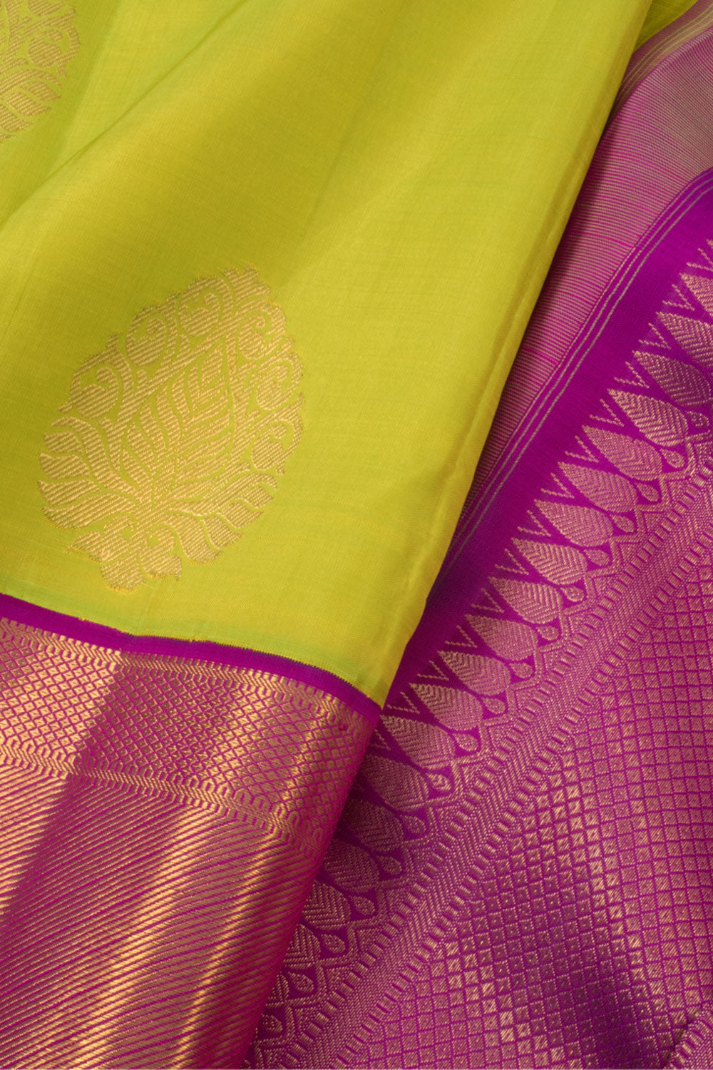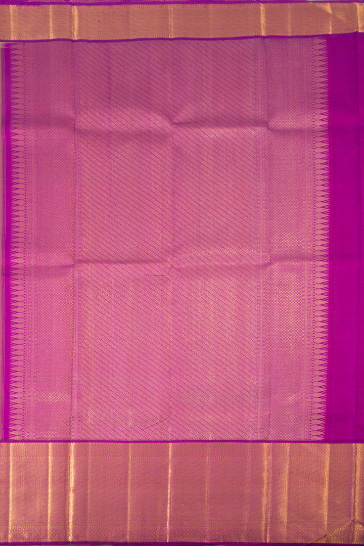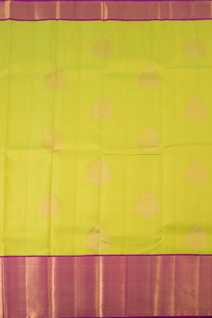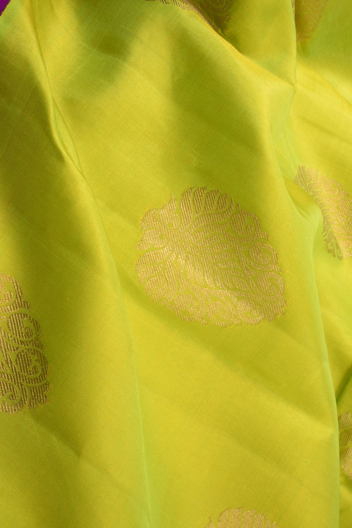 This stunning Sheen Green Pure Zari Korvai Bridal Kanjivaram Silk Saree features beautiful floral motifs along its body. The vibrant purple border is adorned with graceful mayilkann and diagonal zari patterns. The pallu also showcases these intricate Mayilkann designs, making this saree truly special. It comes with a complementary purple blouse piece to complete the look.