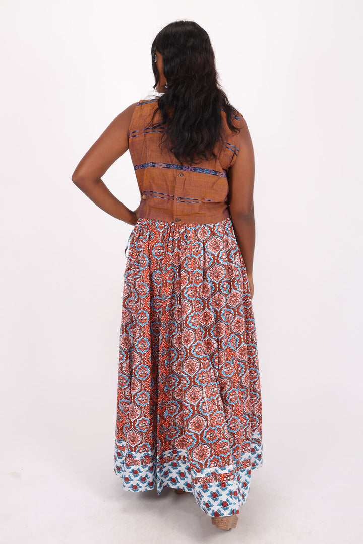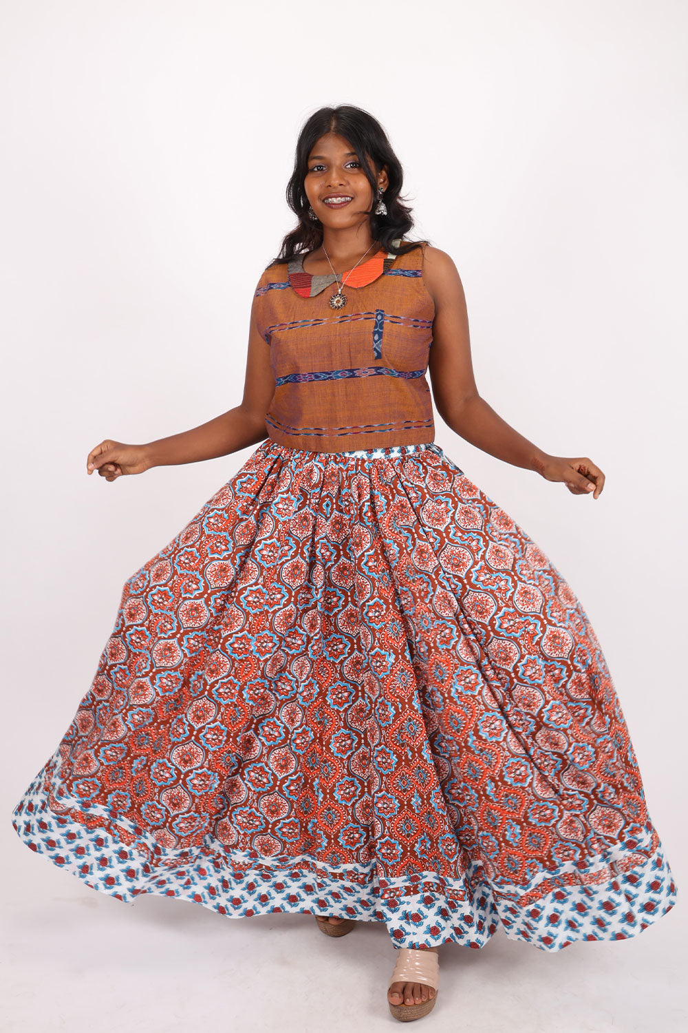Brown Hand Block Printed Cotton Skirt This beautiful denim blue hand block printed cotton skirt is designed to bring style and comfort to your wardrobe. Made with high quality cotton, it's perfect for any occasion and will keep you looking and feeling great all day long.