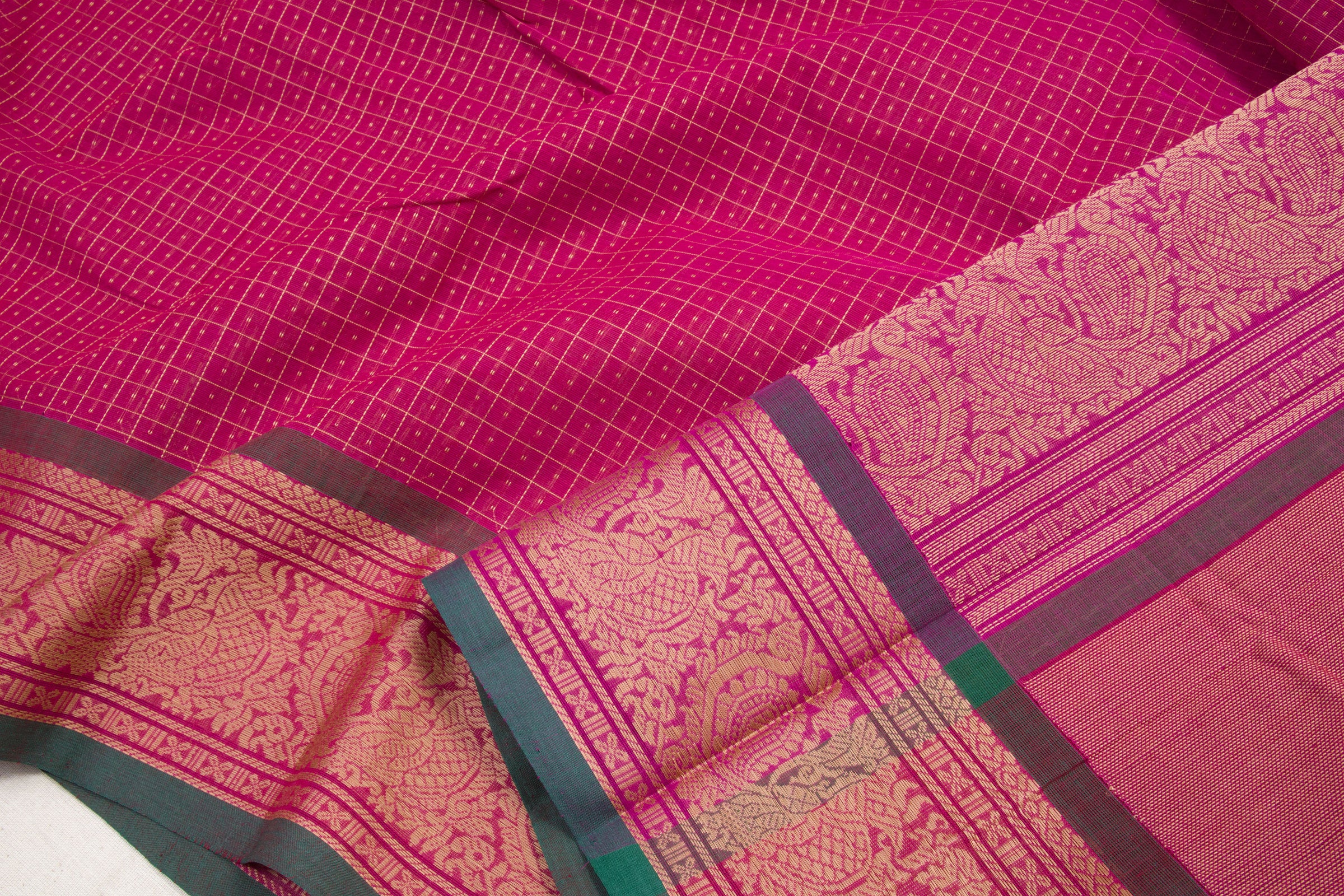 Experience pure luxury and comfort with this stunning 100% cotton Green Handwoven Kanchi Cotton Saree! Its captivating contrasting border and intricate check design add an unbeatable touch of elegance to any occasion. Take your...