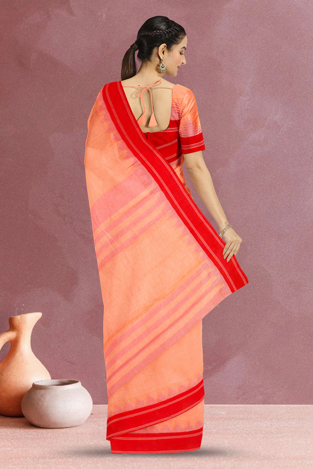This Stunning Peach Korvai Kanchi Cotton Saree boasts a Vibrant Red Temple Border. The saree is adorned with a striped pallu and accompanies a matching blouse.