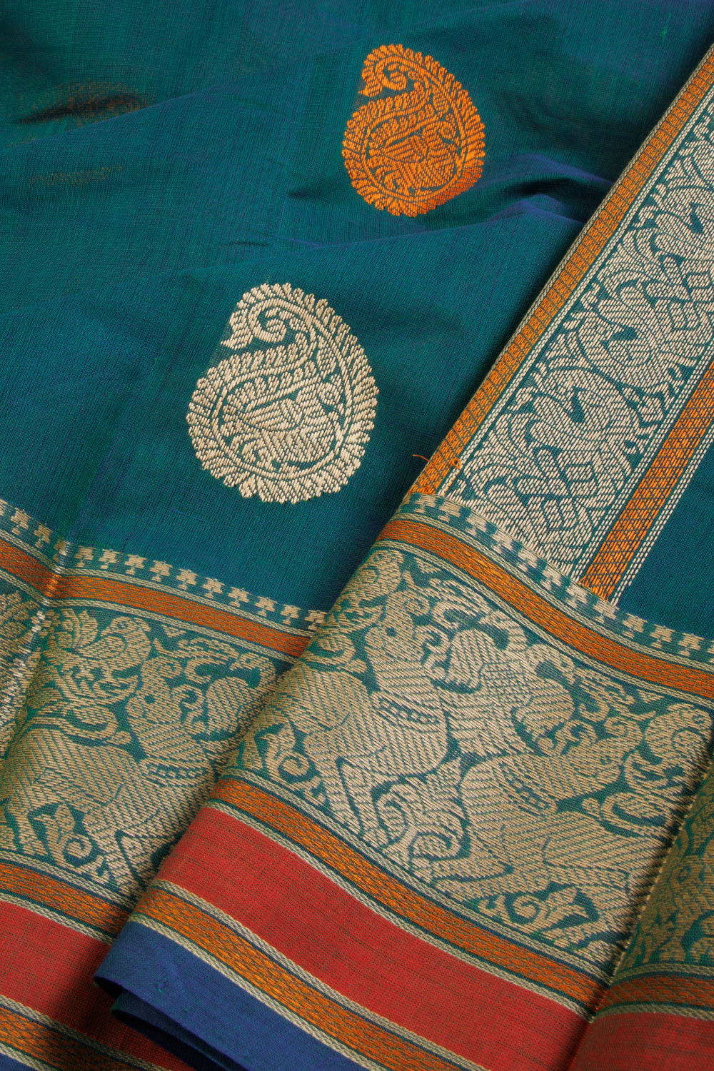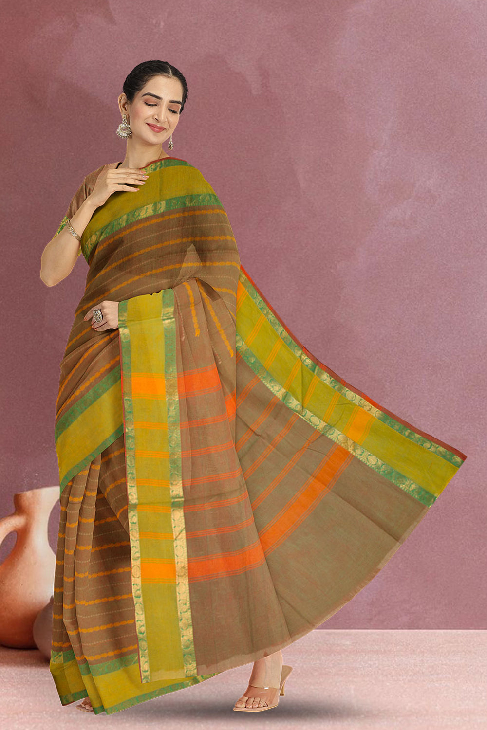 Green Handwoven Kanchi Cotton Saree Experience the elegance and comfort of this handwoven saree, made from high-quality Kanchi cotton. Perfect for any occasion, it's a statement piece that will make you feel confident and styli...