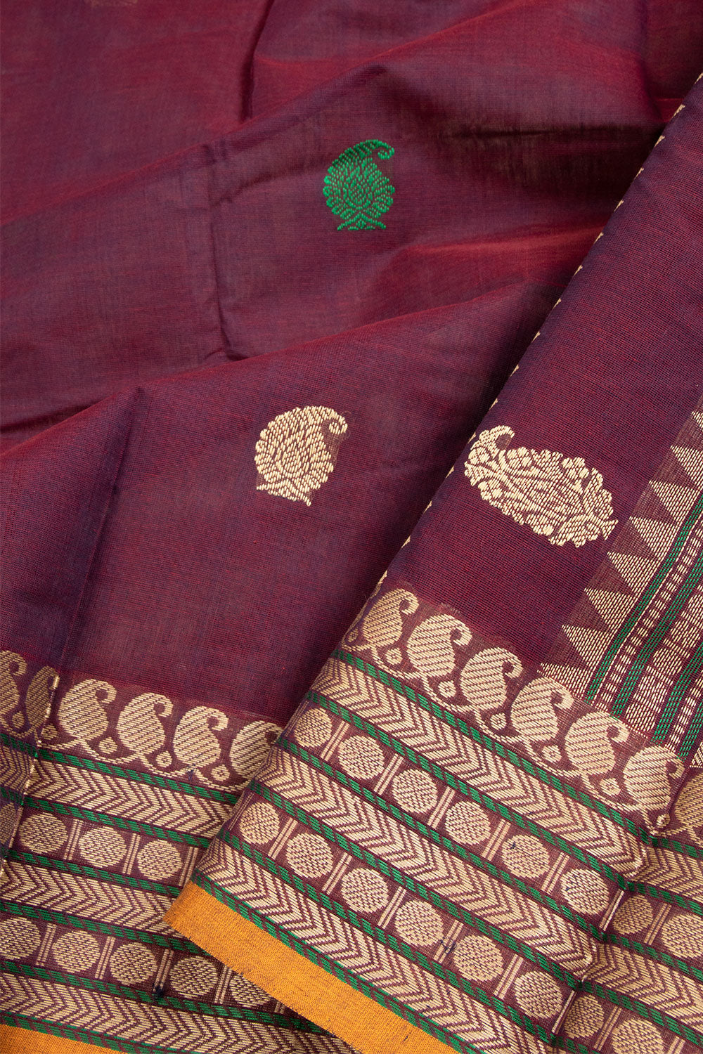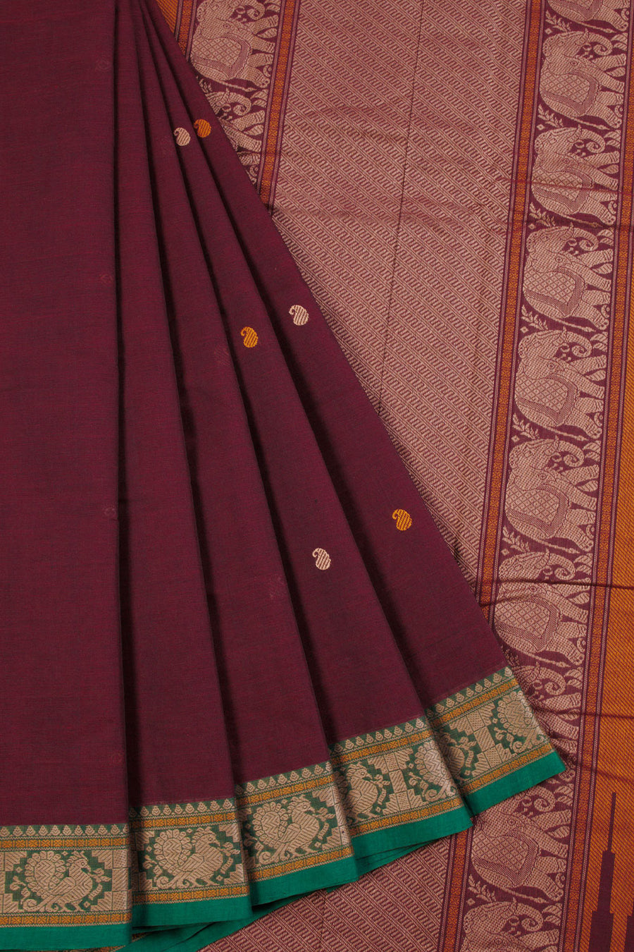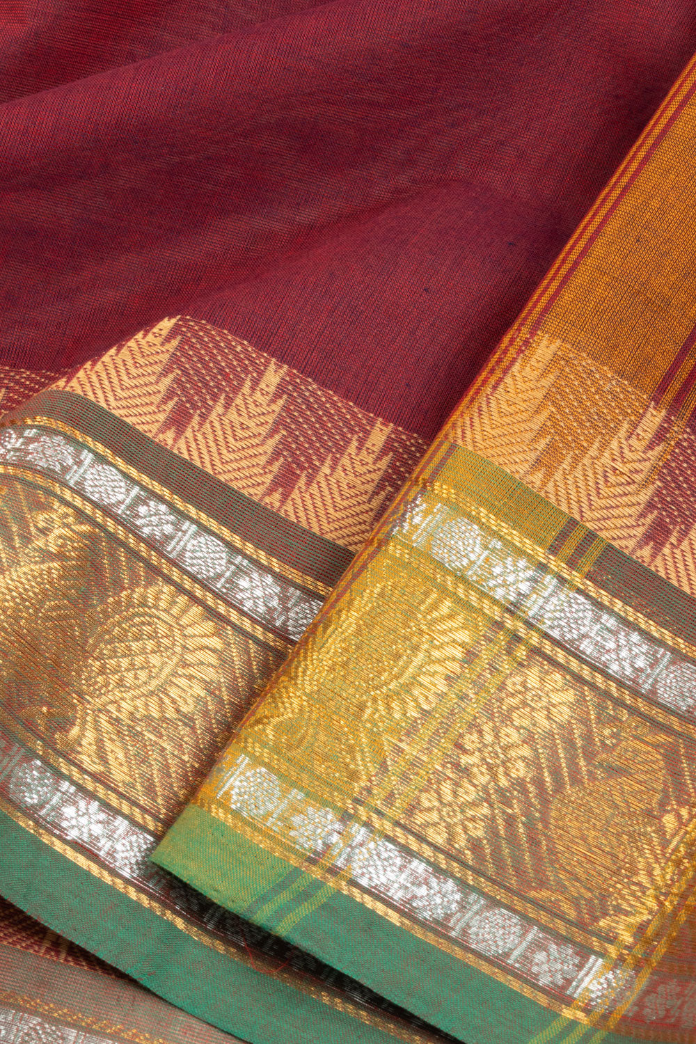Look gorgeous in this maroon handloom Kanchi cotton saree. Its soft, lightweight fabric is perfect for daywear, giving you a fashionable yet comfortable look. This saree is sure to be a conversation starter!