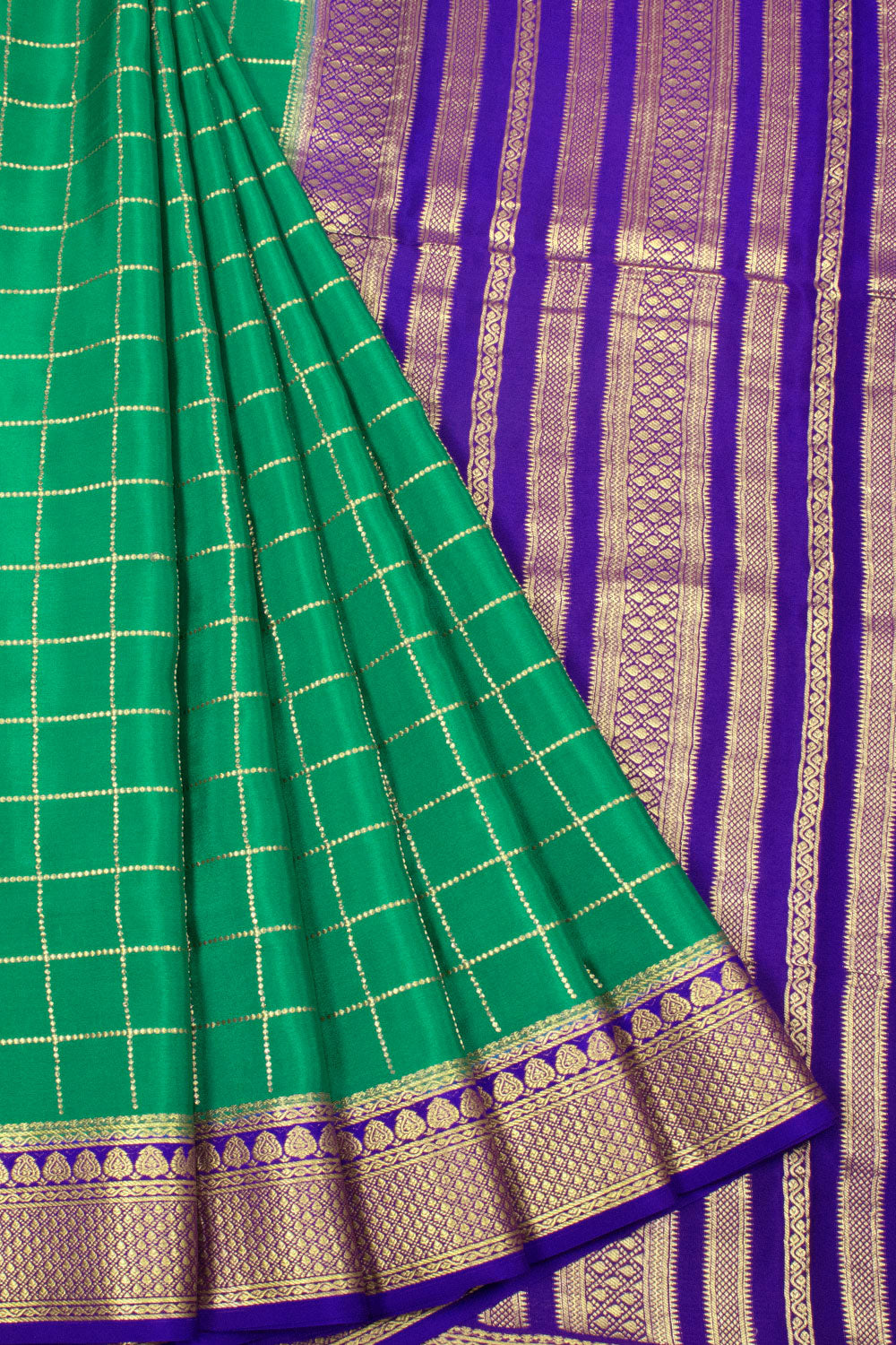 Elevate your elegance with this Peacock Green with Blue Mysore Crepe Silk Saree. Crafted from soft, flowing crepe silk, it drapes beautifully to enhance your silhouette. The rich peacock green complemented by striking blue acce...