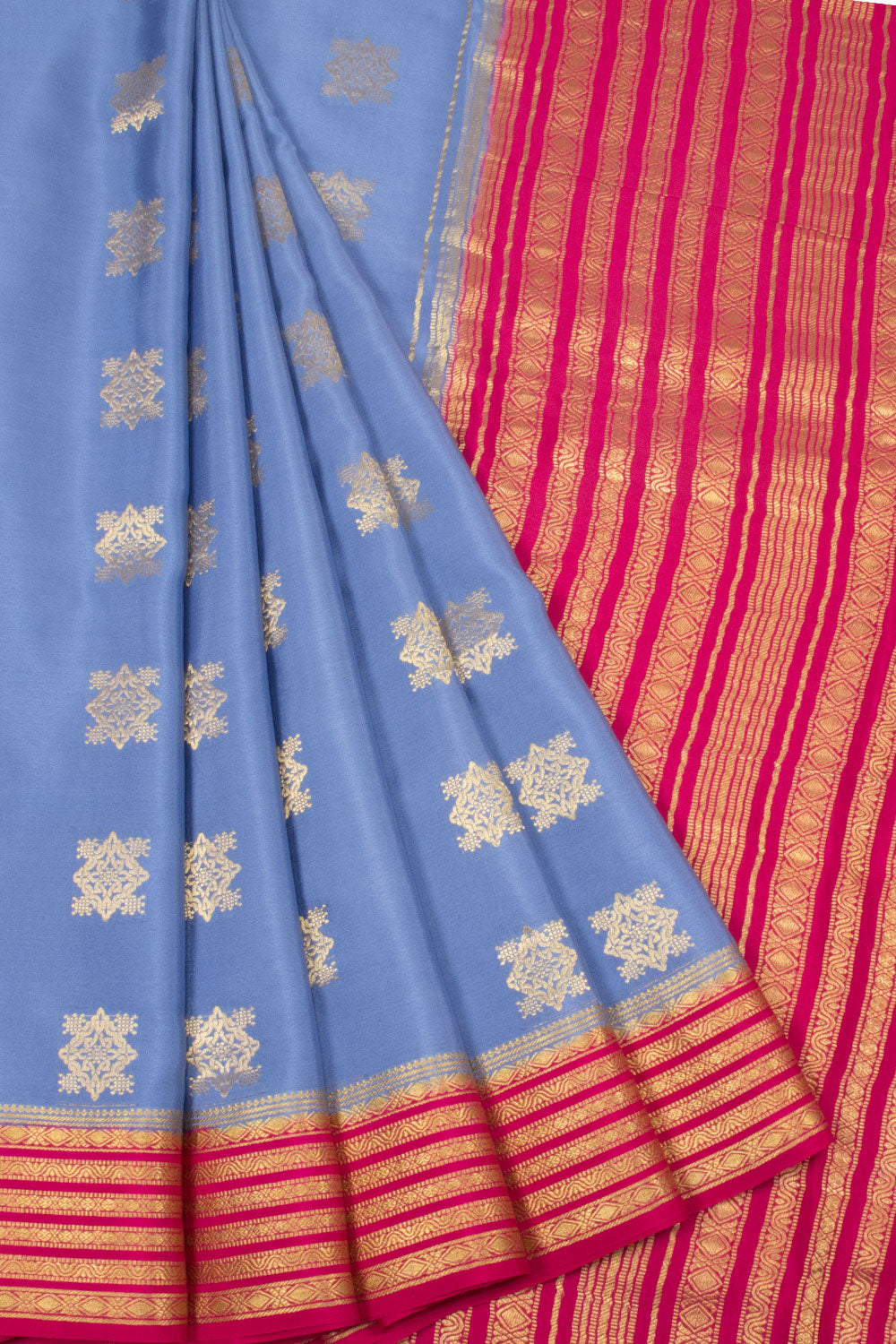 Make a bold statement with this Steel Blue with Magenta Mysore Crepe Silk Saree. Crafted from luxurious crepe silk, it offers a smooth, elegant drape that flatters every silhouette. The striking combination of deep steel blue a...