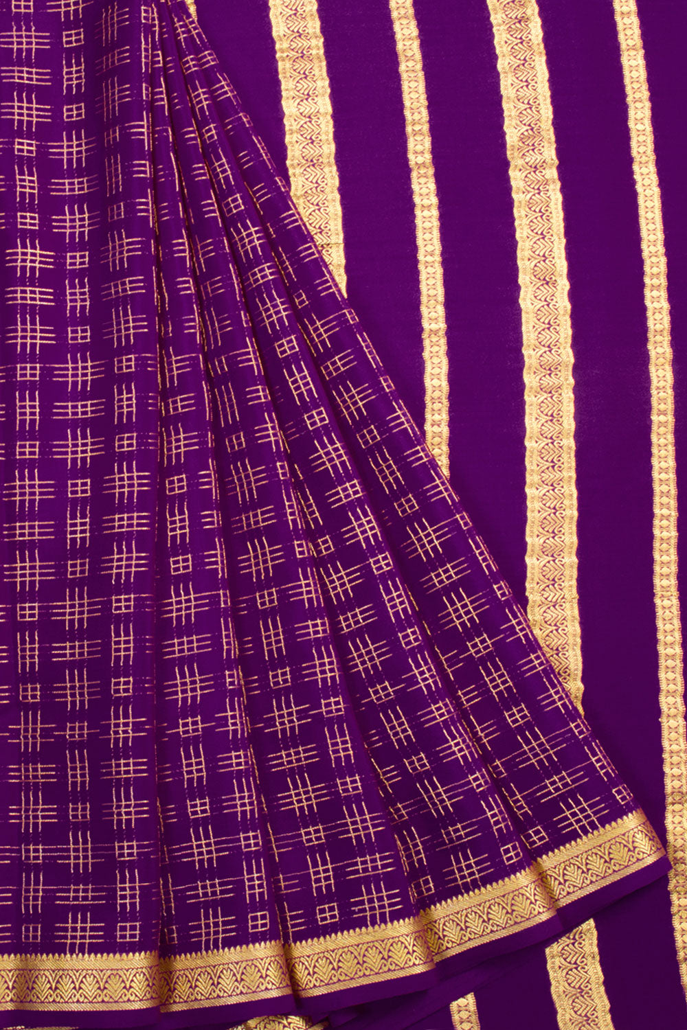 Elevate your elegance with this Violet Mysore Crepe Silk Saree. Made from smooth, lightweight crepe silk, it drapes gracefully to enhance your silhouette. The rich violet hue adds a regal and sophisticated touch, perfect for fe...
