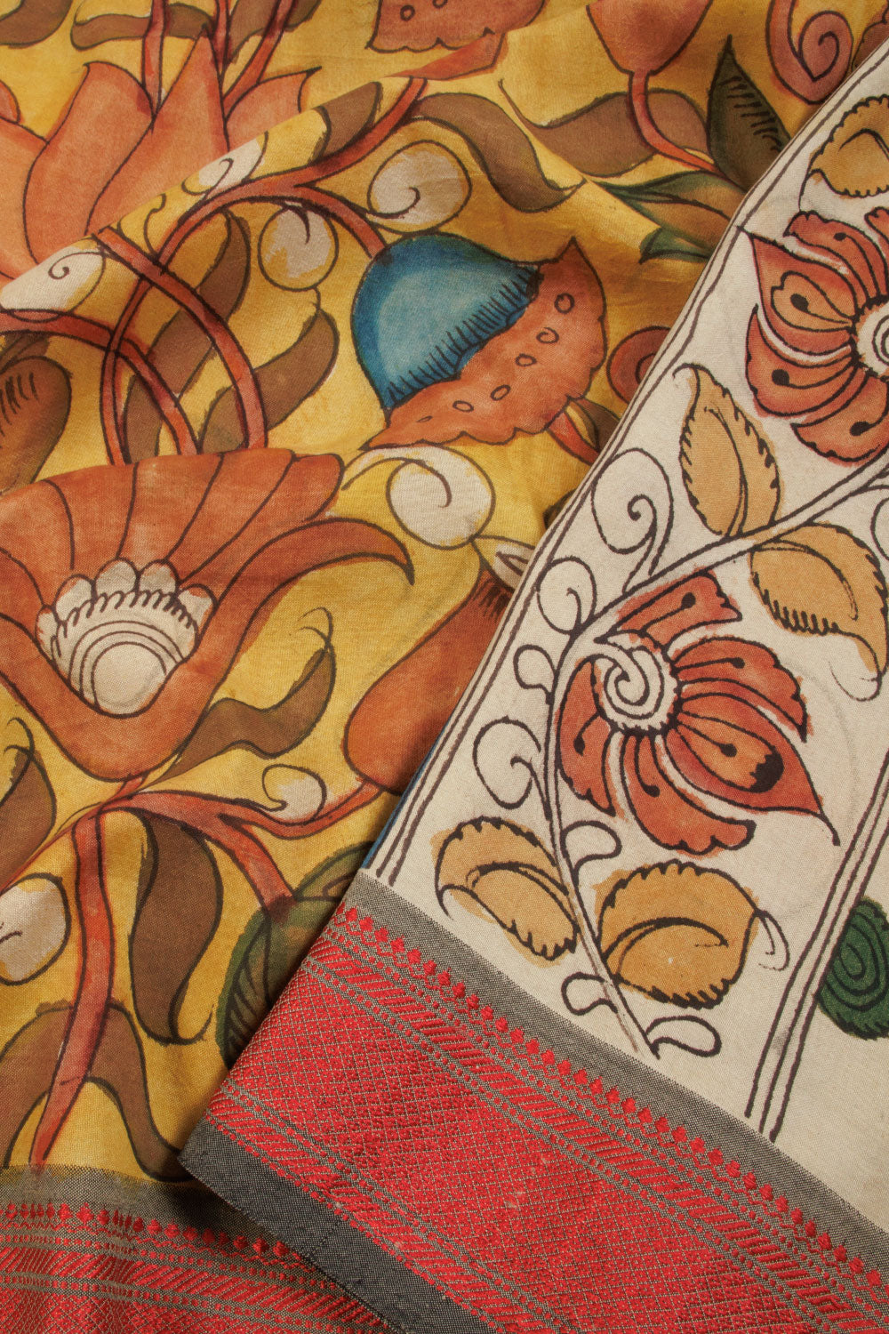 Fall in love with the gorgeous Yellow Hand Painted Pen Kalamkari Silk Cotton Saree - a masterpiece of artistry and skill. Each saree is individually crafted with natural colors and dyes, resulting in a faded, earthy tone that e...
