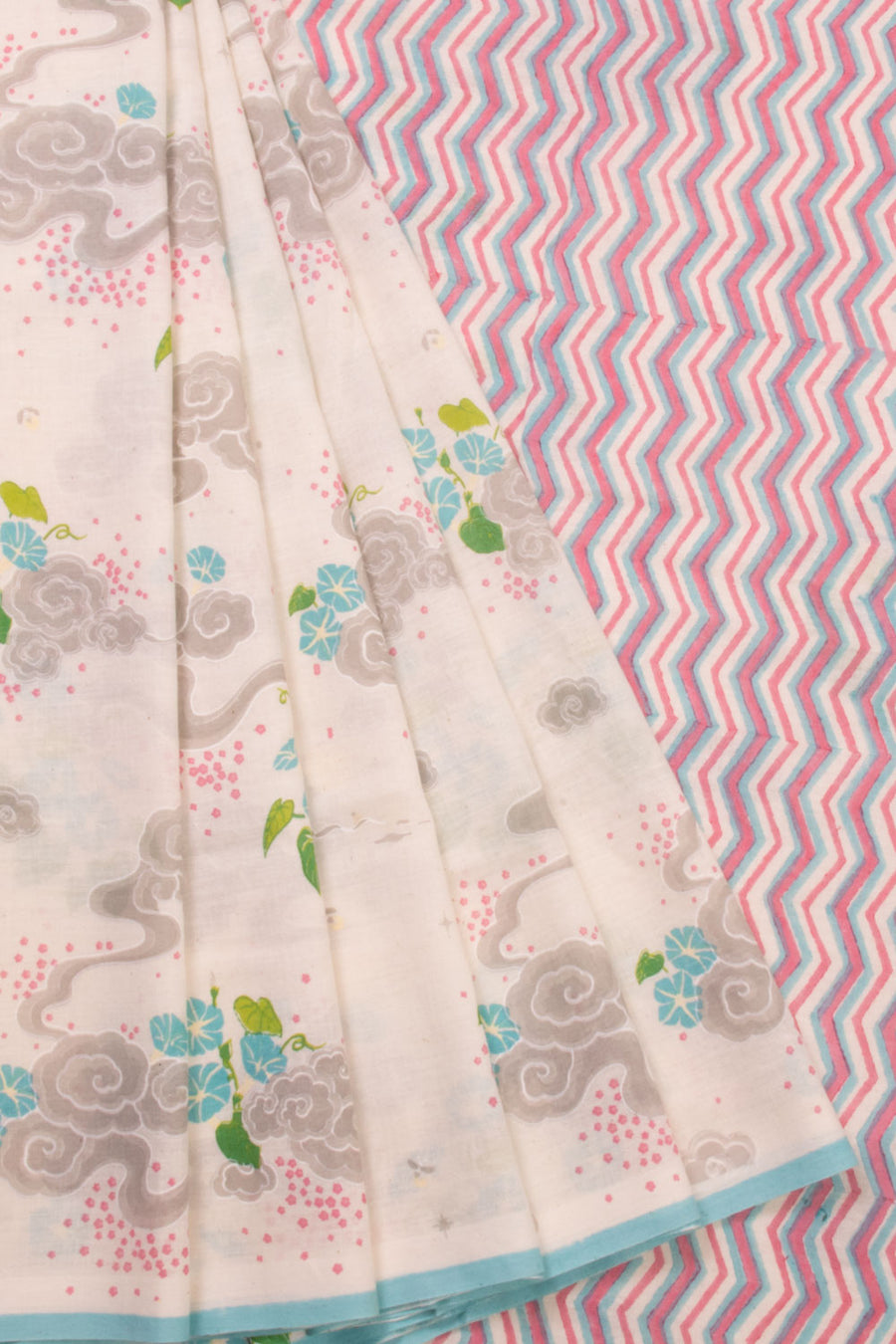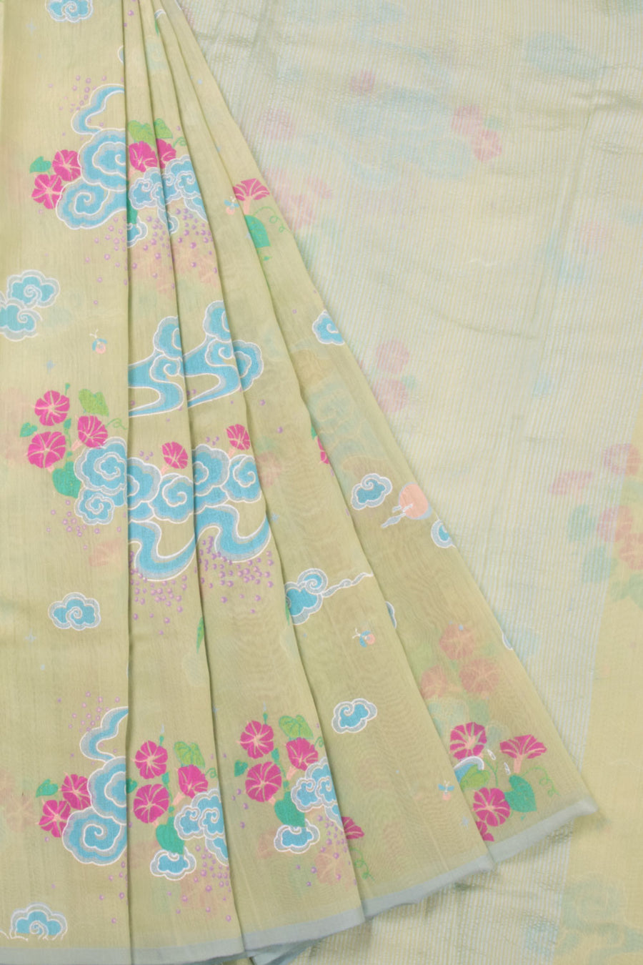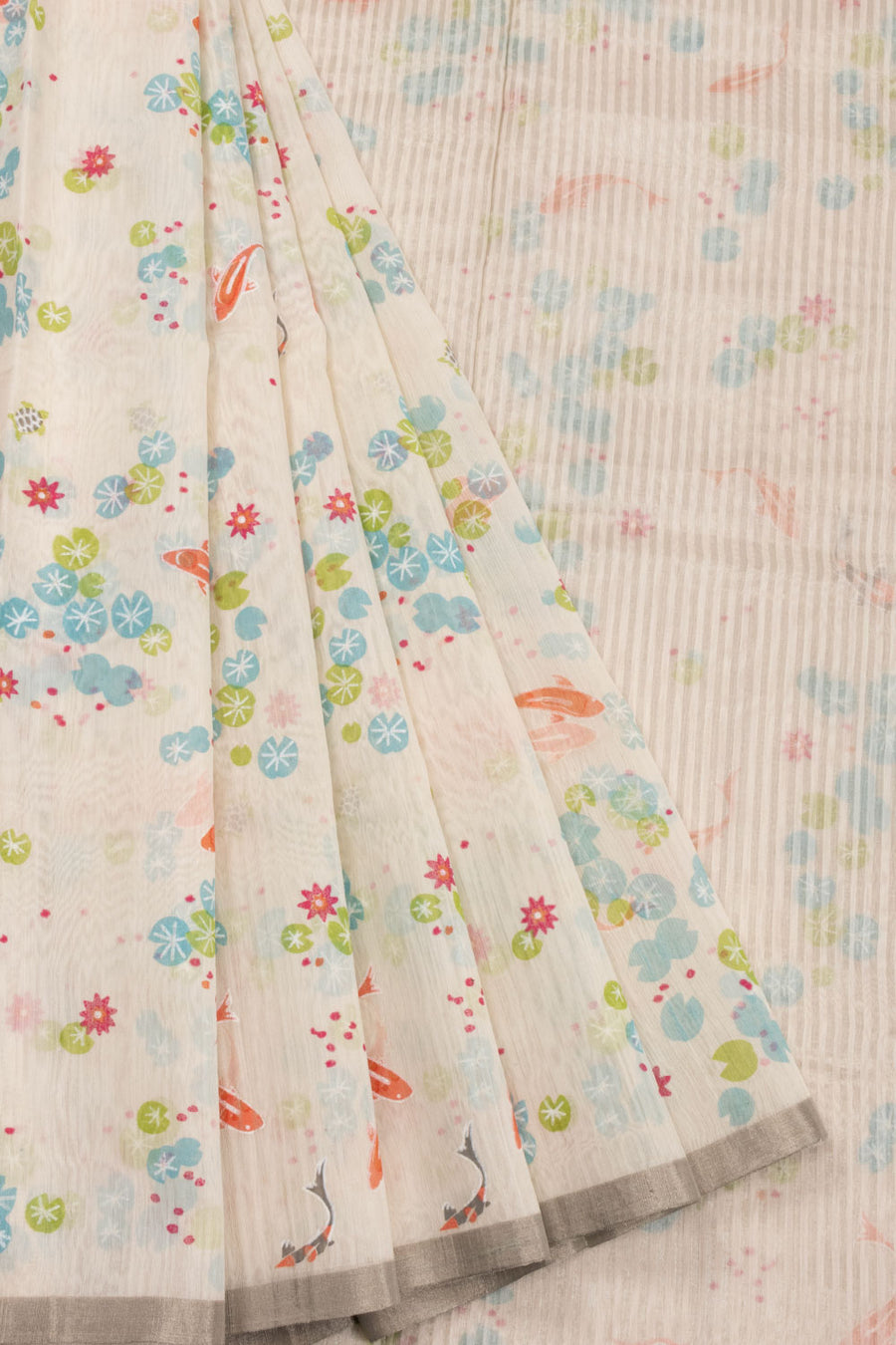 Flaunt timeless elegance in this charming cream Chanderi saree featuring playful parrots perched among delicate florals! This printed silk-cotton masterpiece brings together sophistication and whimsy in the most graceful way. T...