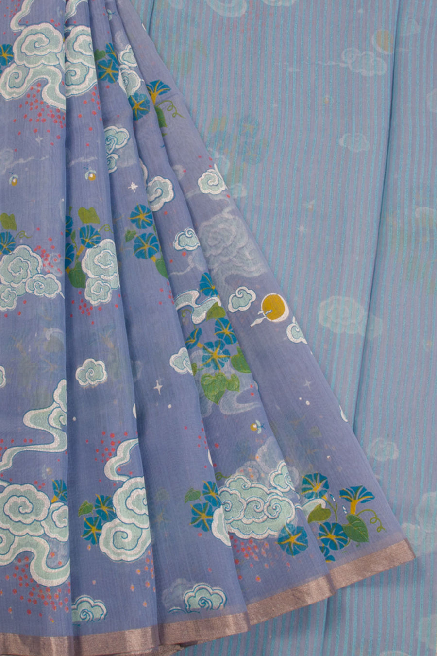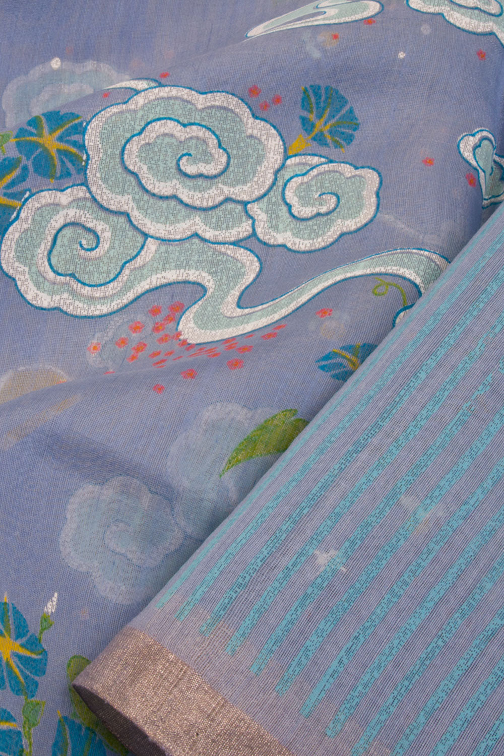 Sing with style in this vibrant blue Chanderi saree that's bursting with cheerful parrots and blooming florals! This printed silk-cotton treasure combines comfort with eye-catching design, making it perfect for celebrations, fe...