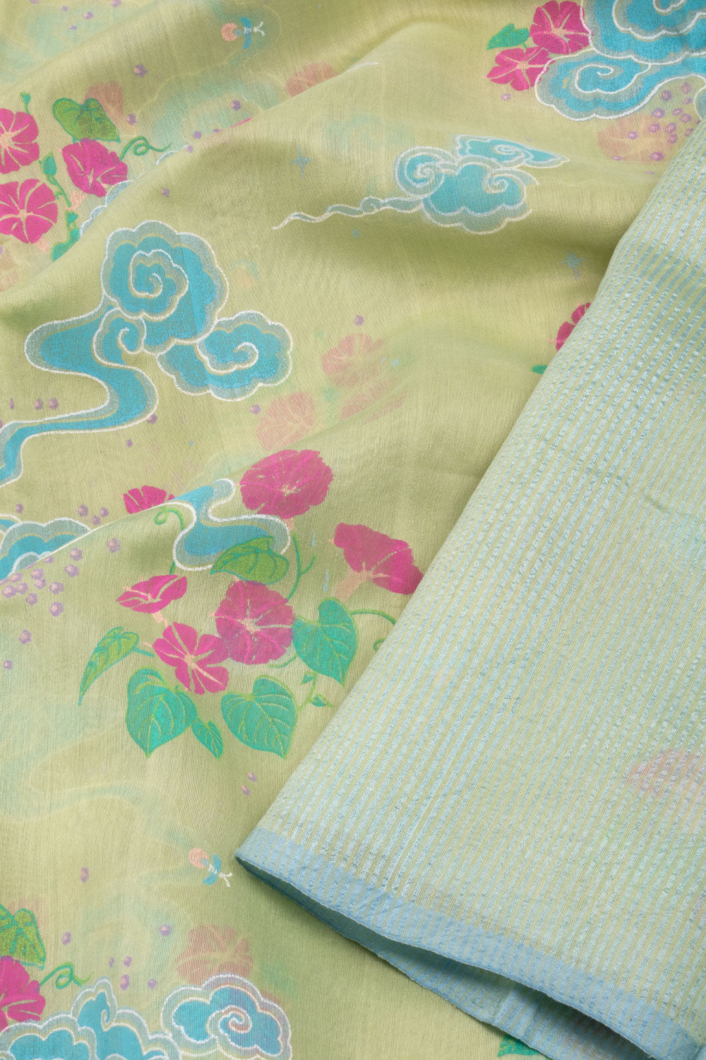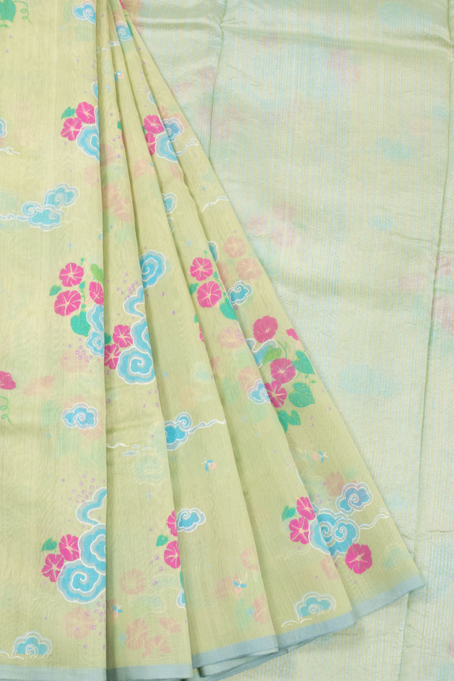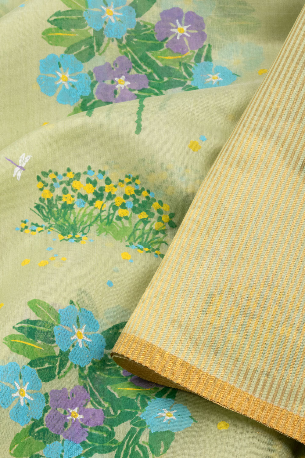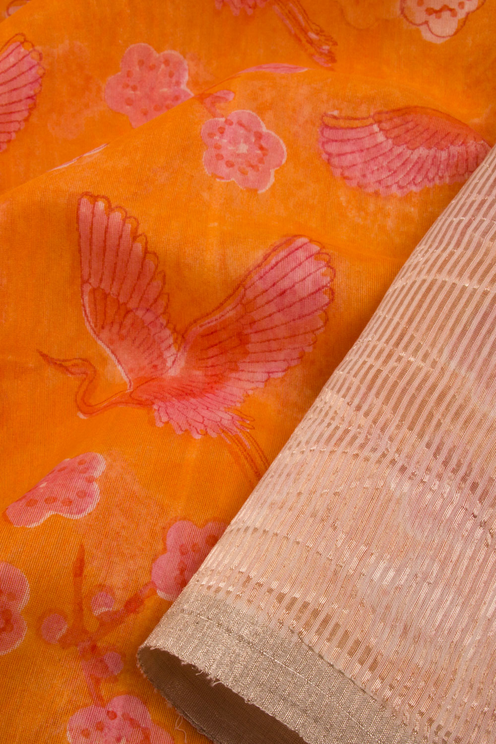 Strike a pose in this fabulous Green Chanderi saree that celebrates the glamorous flamingo in all its glory! Elegant flamingos mingle with delicate florals across this printed silk-cotton canvas, creating a look that's both sop...