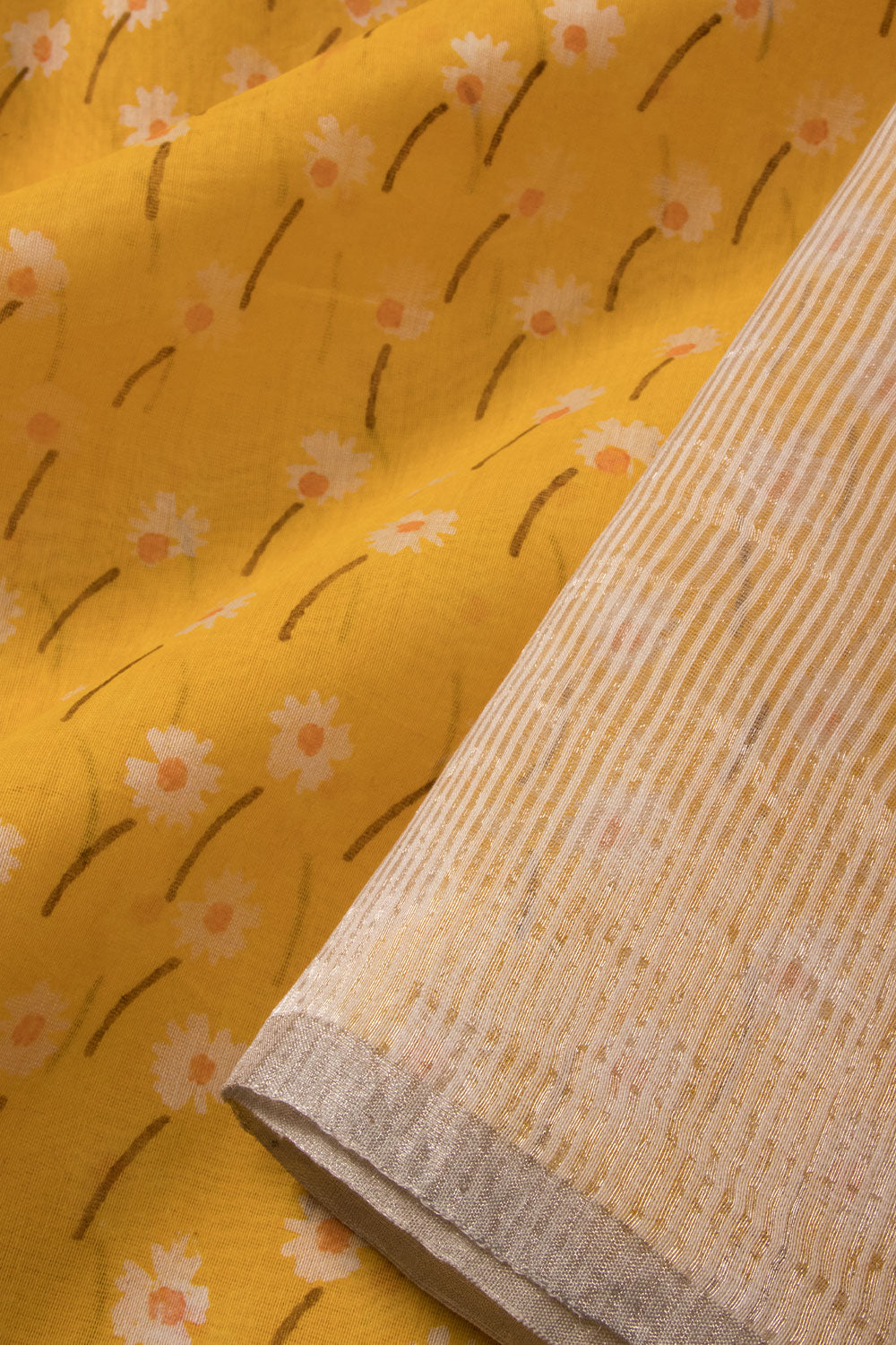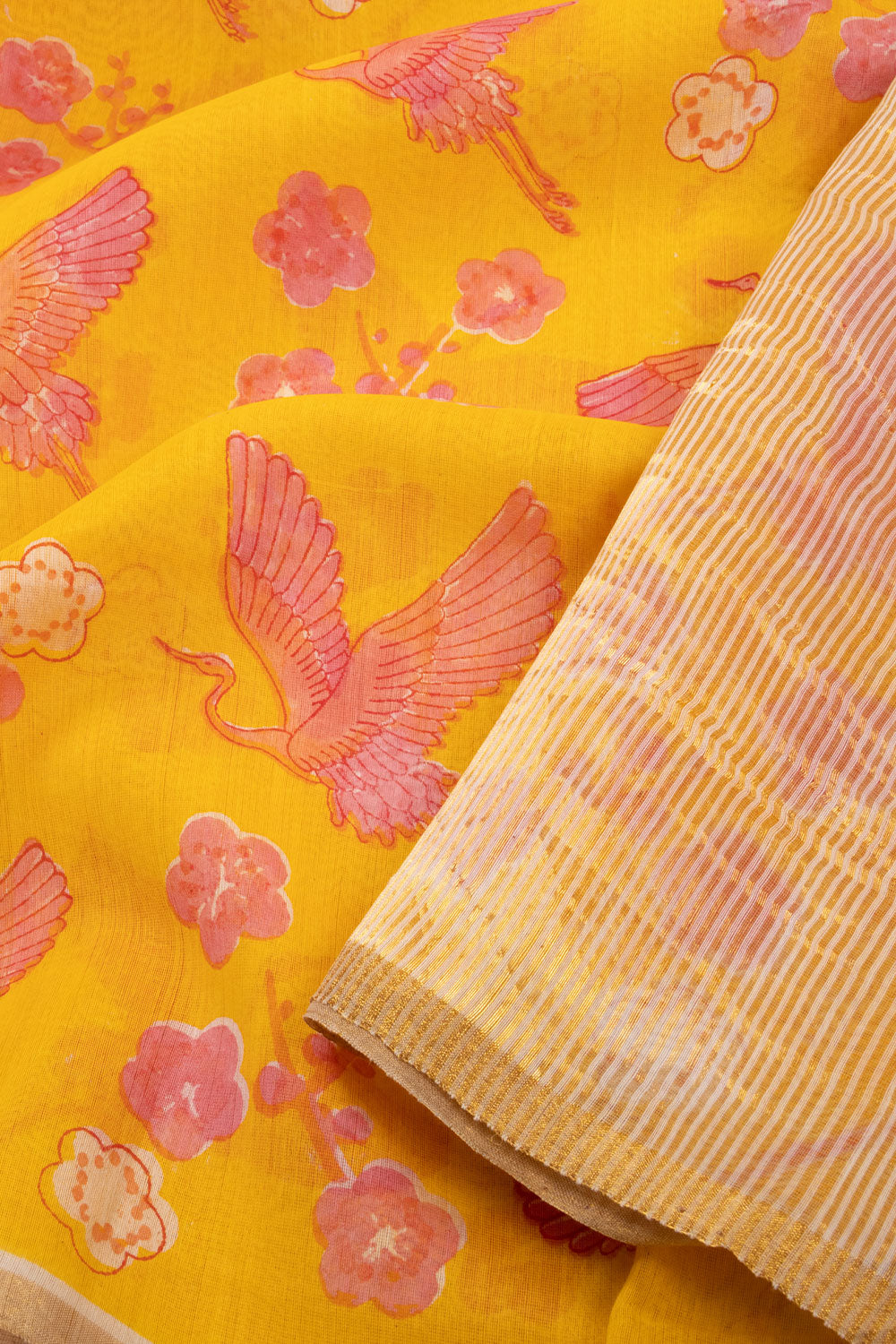 Dive into elegance with this cheerful yellow Chanderi saree that's absolutely enchanting! Adorned with graceful swans gliding through lotus blooms, this printed silk-cotton blend captures nature's poetry in every drape. The lig...