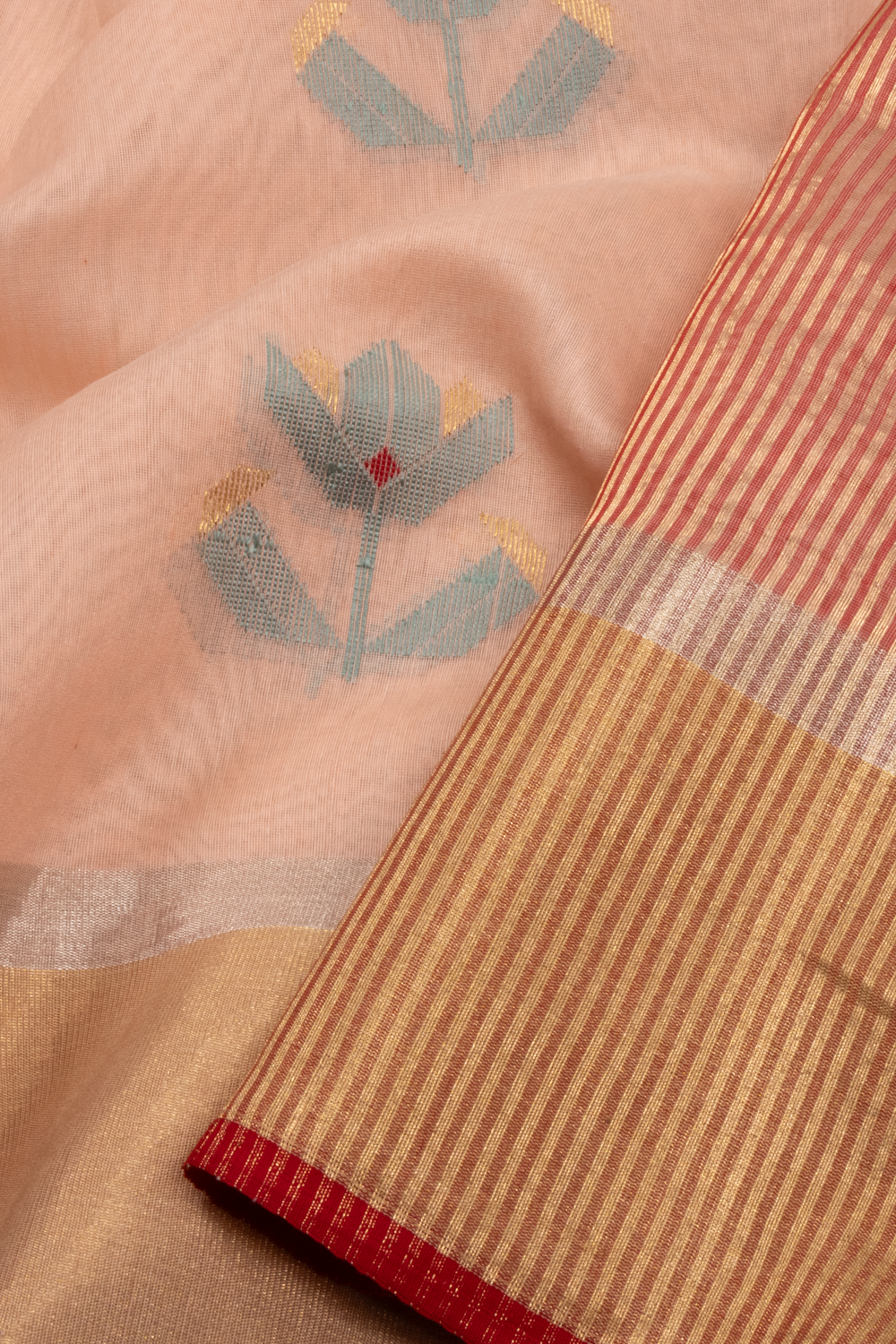 Enhance your wardrobe with the Peach Chanderi Printed Silk Cotton Saree, combining the softness of cotton with the subtle sheen of silk. Its delicate peach hue and elegant prints create a graceful, feminine look perfect for fes...