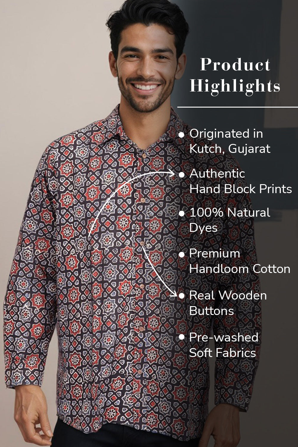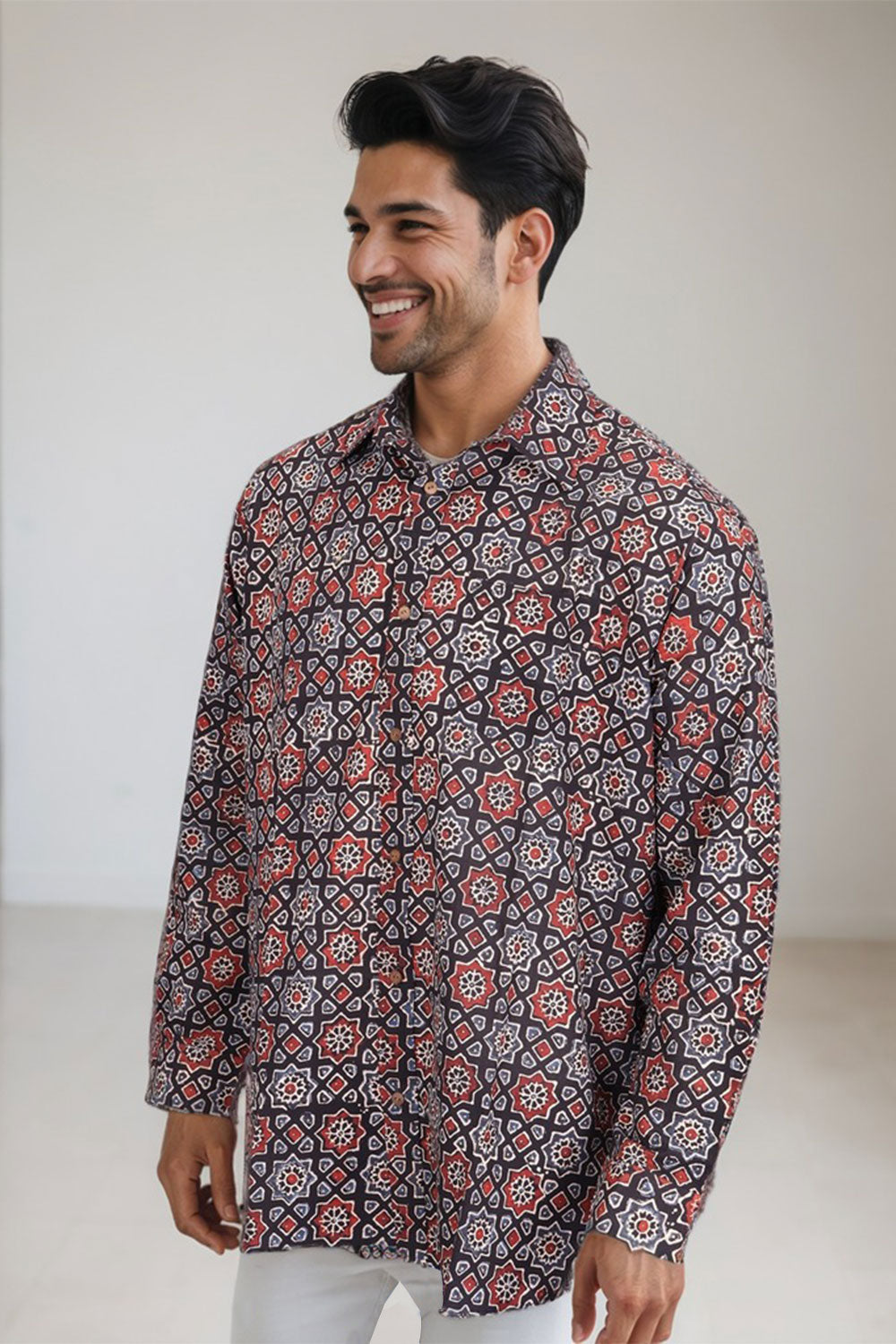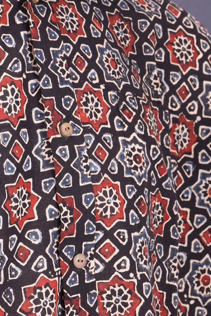 Experience the perfect blend of tradition and style with this Black Ajrakh printed cotton shirt. Crafted using natural dyes and featuring authentic wooden buttons, it ensures comfort and sustainability. Easily pair it with jeans, khaki pants, or shorts to create a versatile, eye-catching outfit that highlights your unique fashion sense.
