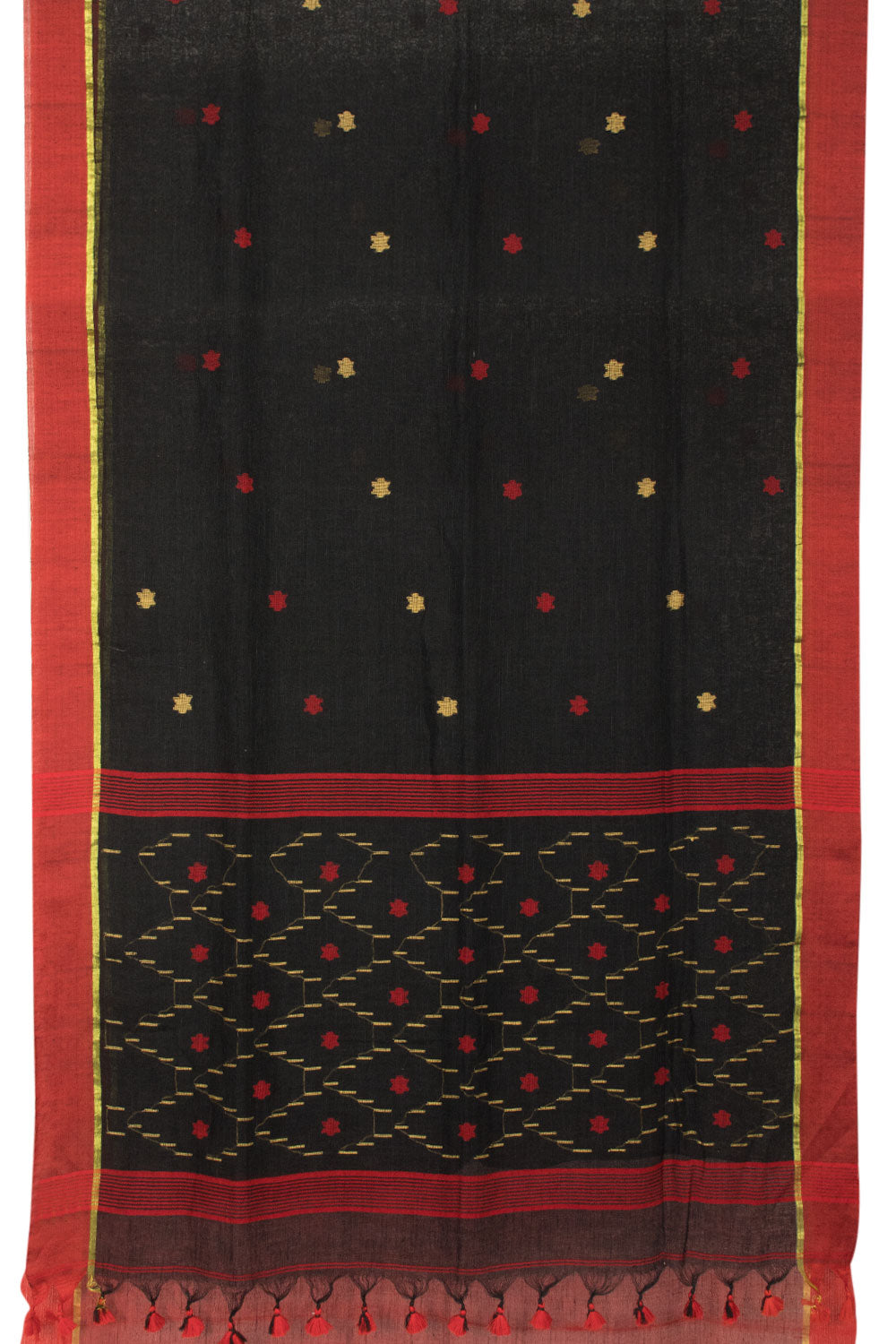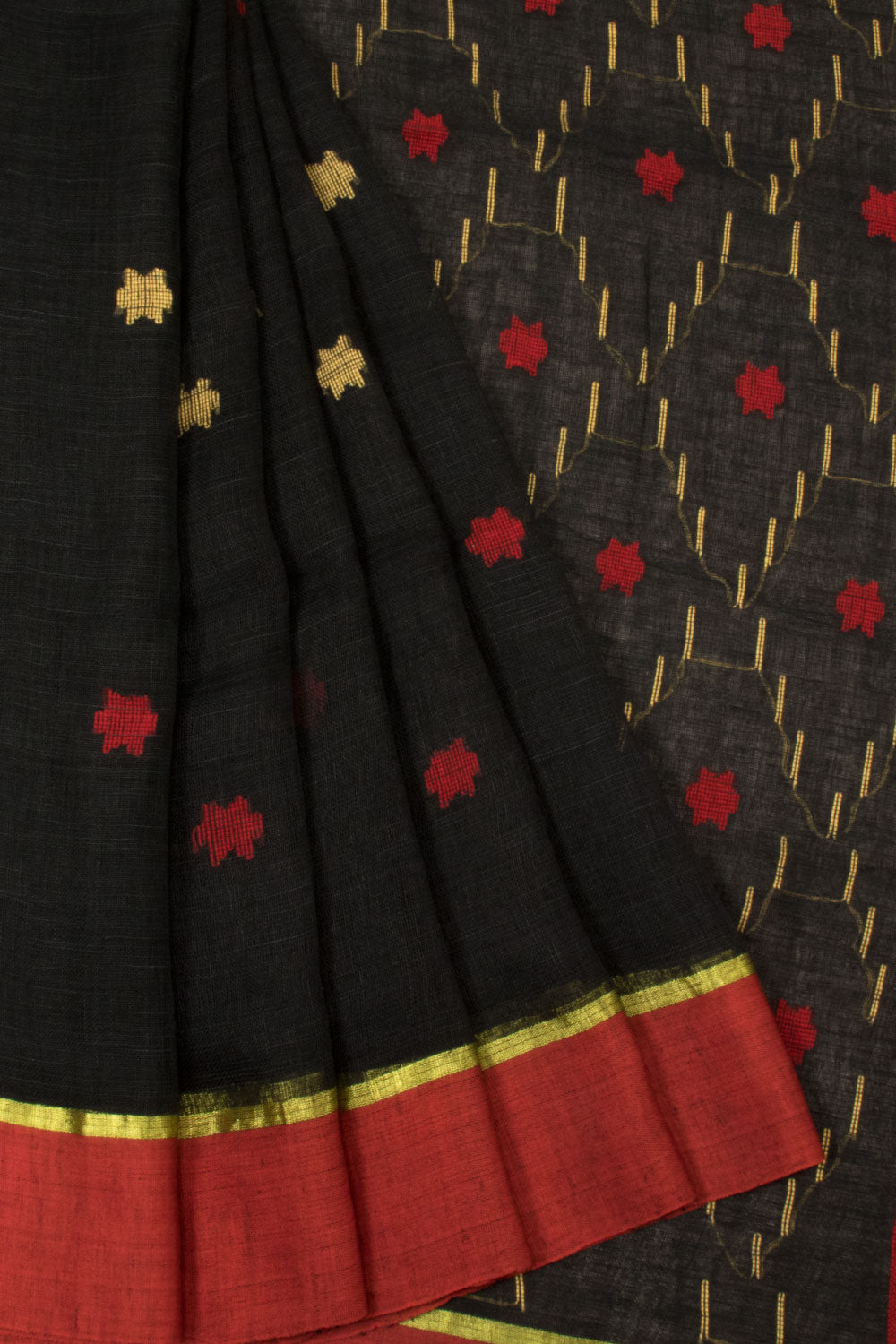 This stunning black Jamdani linen saree is designed to make you look incredible. Its soft fabric and intricate Jamdani weave make it perfect for special occasions. Make a statement and look beautiful in this timeless piece.