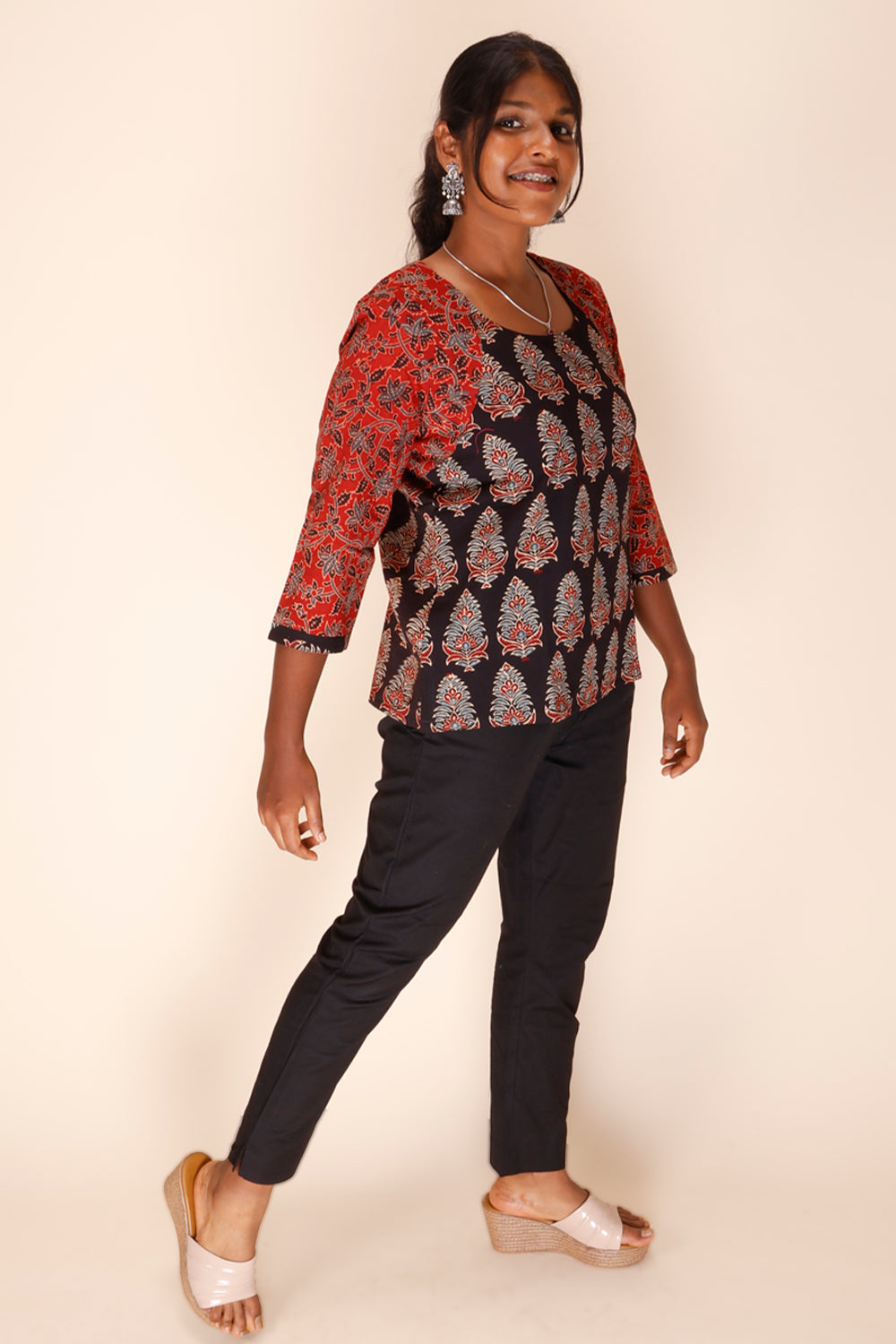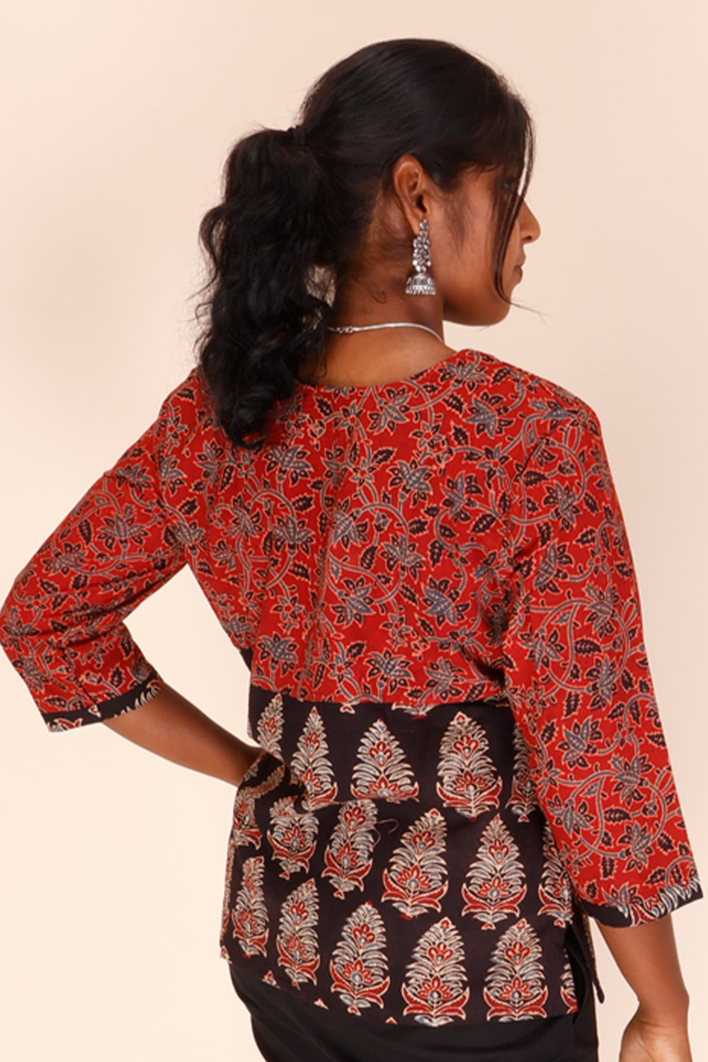 Experience the stunning beauty of our Black Short Ajrakh Cotton Top . Made from high-quality cotton, this top feature a mesmerizing Ajrakh print in rich black. Its short and comfortable design is perfect for any occasion. Upgrade your wardrobe with this unique and versatile piece!
