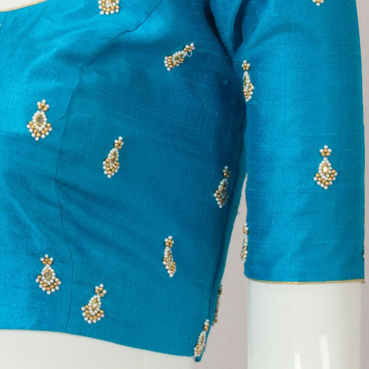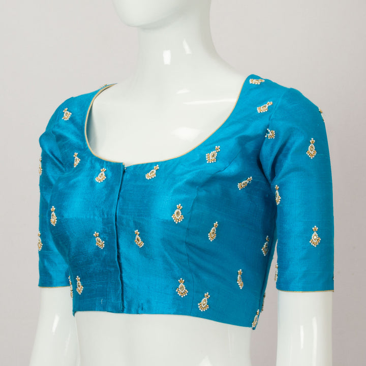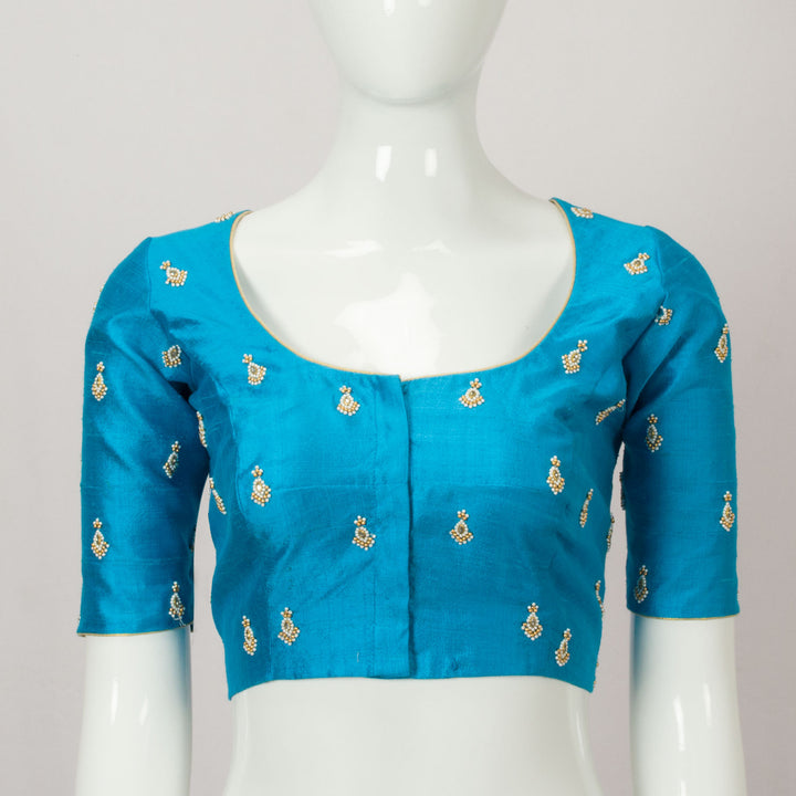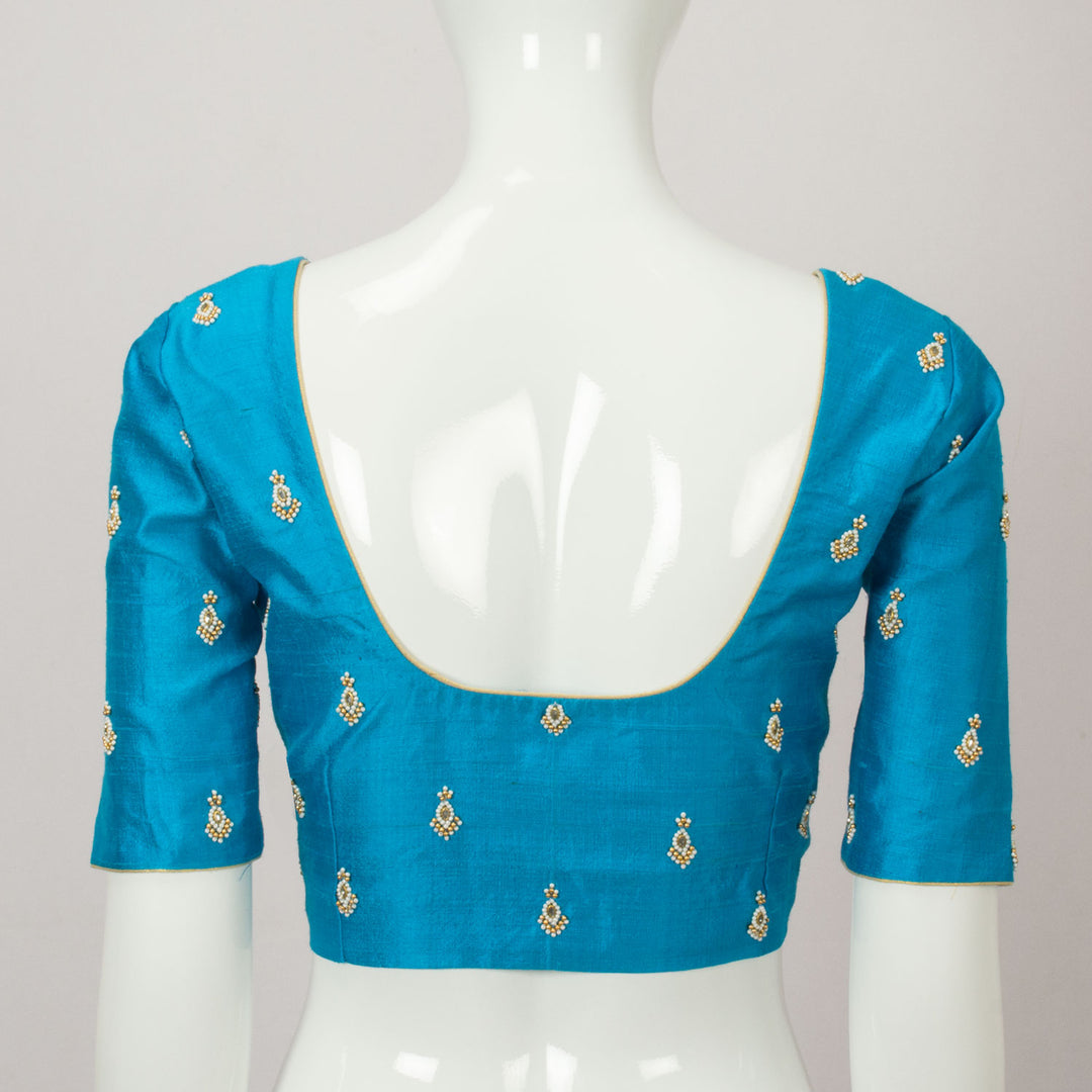 Look your best in this blue raw silk blouse embellished with intricate Aari embroidery. Its timeless design will make sure you stand out from the crowd.