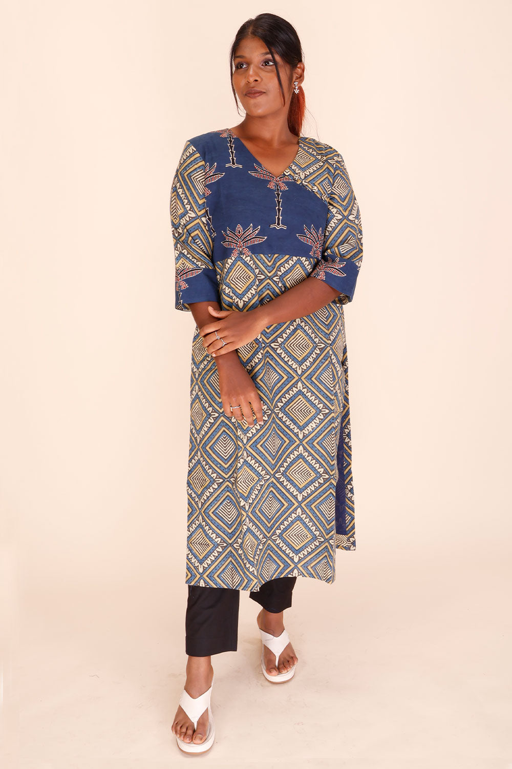 This stylish kurta features an Anghrakh style overlay design and a captivating play of shades of blue with contrasting geometric and floral patterns. Embodying a modern and unique look, it is a must-have for the fashion-forward individual.