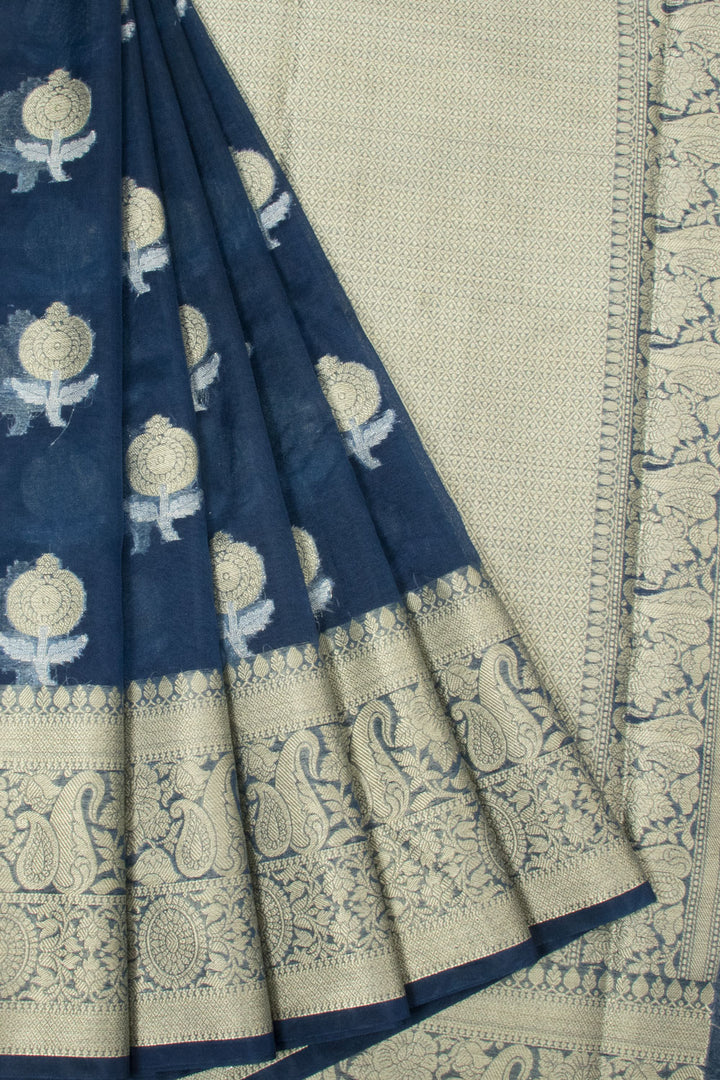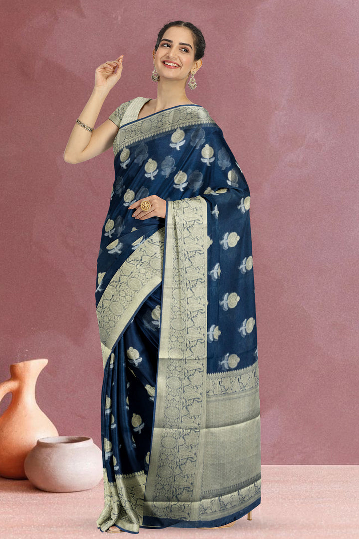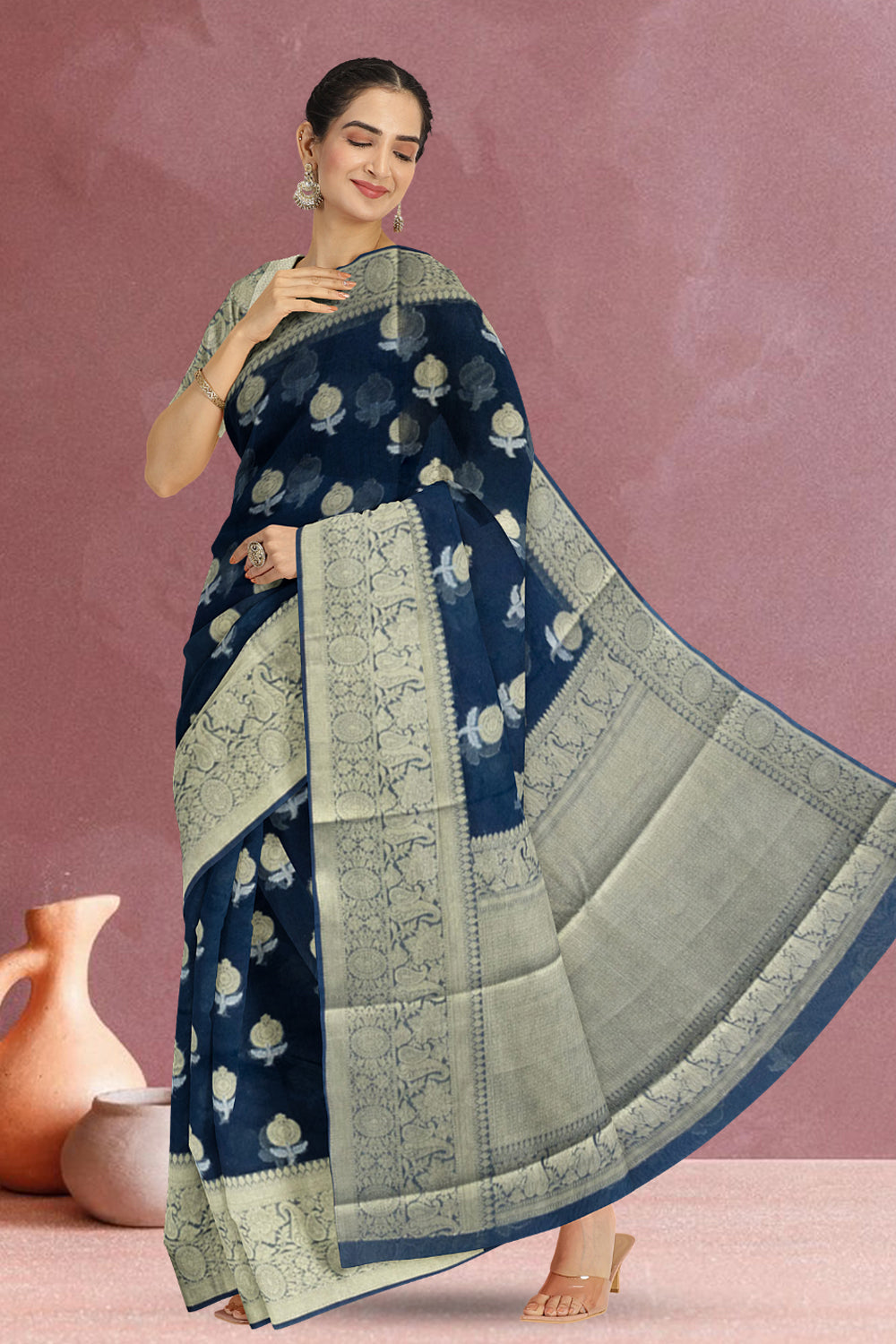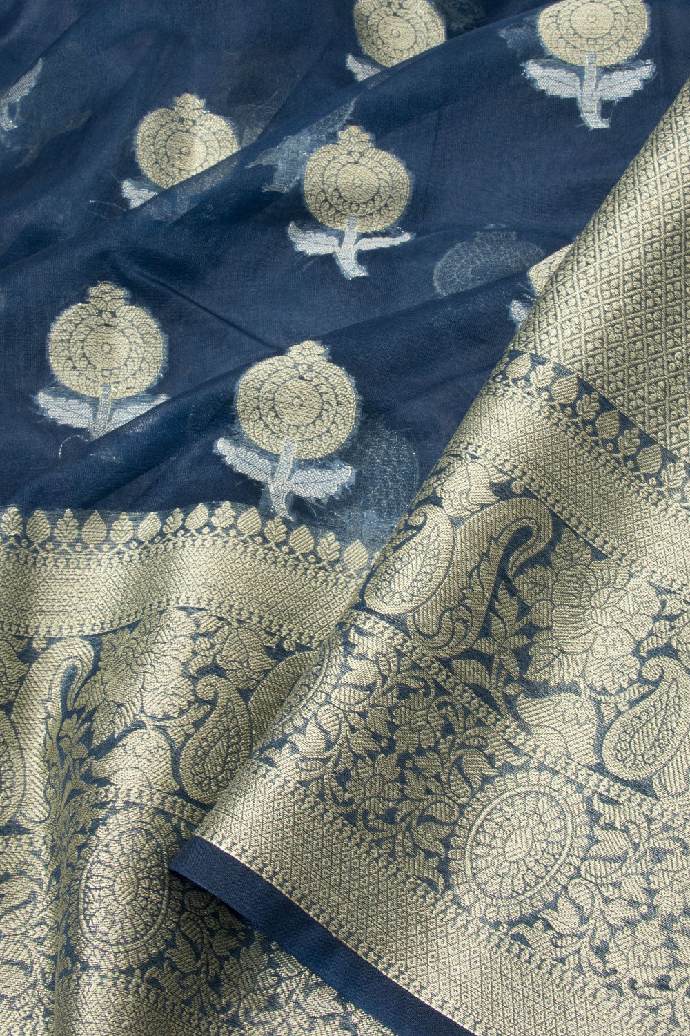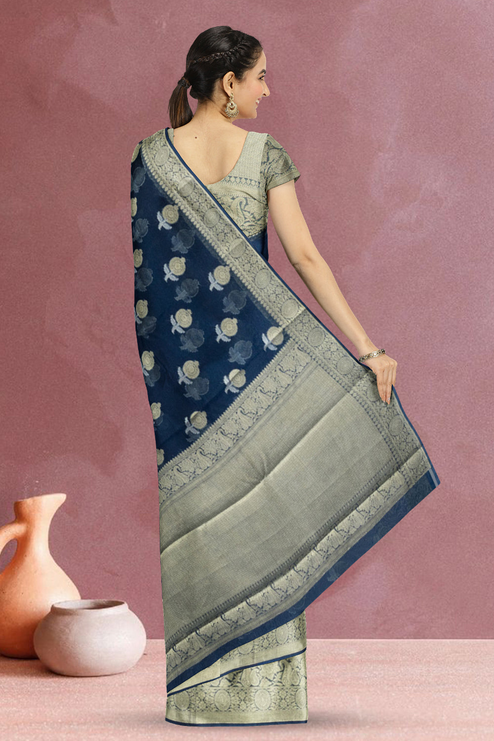 Blue Banarasi Organza Saree with Floral Motifs This saree adds an effortless and timeless elegance to your wardrobe. You'll love the intricate floral motifs that are sure to make your outfit stand out.