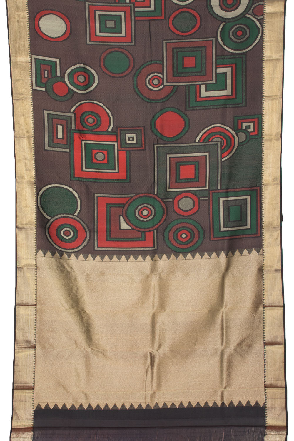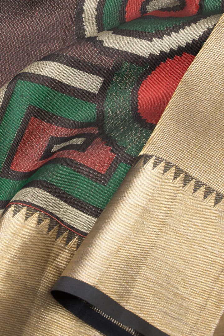 Experience the beauty of this Coffee Brown Handloom Kanjivaram Silk Saree, featuring a modern cubism inspired design. The intricate squares and circles in shades of silver, green and red are perfectly complemented by the Bold Gold Zari Bavanji Border and Tissue Pallu. Complete the look with the contrast chilli red blouse.