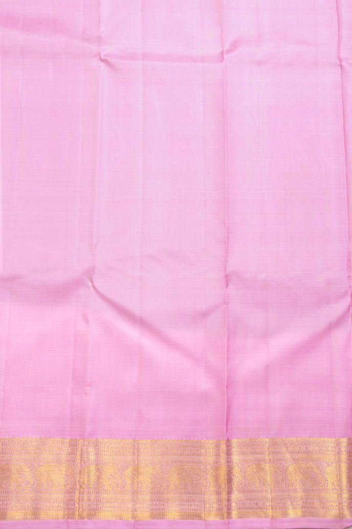 This Stunning Lavender Pure Zari Korvai Kanjivaram Silk Saree boasts exquisite Elephant and Flying Horse Motifs throughout. The Pink Border adds a touch of contrast and features Elephant and Floral Motifs. The Grand Zari Pallu is adorned with beautiful floral designs, and this saree includes a complementary blouse.
