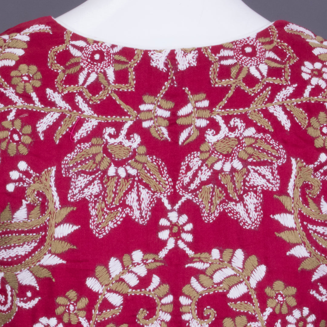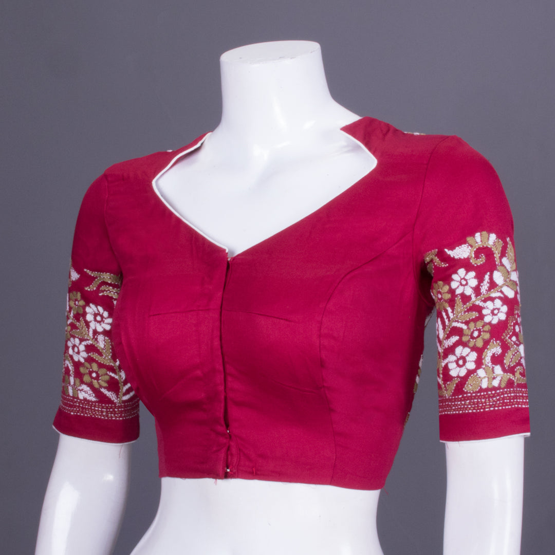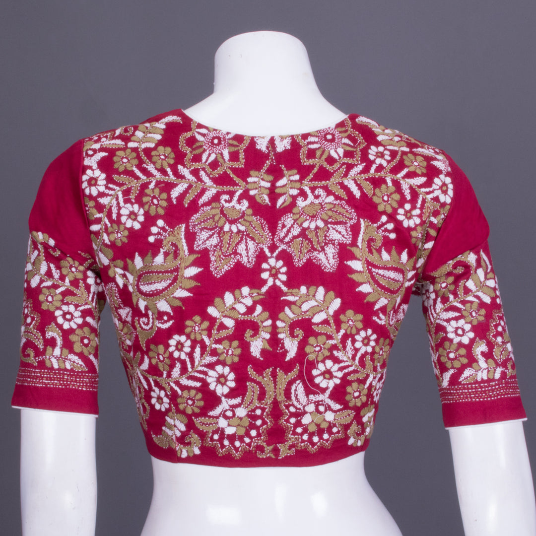 Elevate your wardrobe with our Maroon Kantha Embroidered Cotton Blouse! Perfect for any occasion, this blouse features intricate embroidery and soft cotton fabric for ultimate comfort. Stand out and feel confident in this unique and stylish piece. Upgrade your style with our Maroon Kantha Embroidered Cotton Blouse.