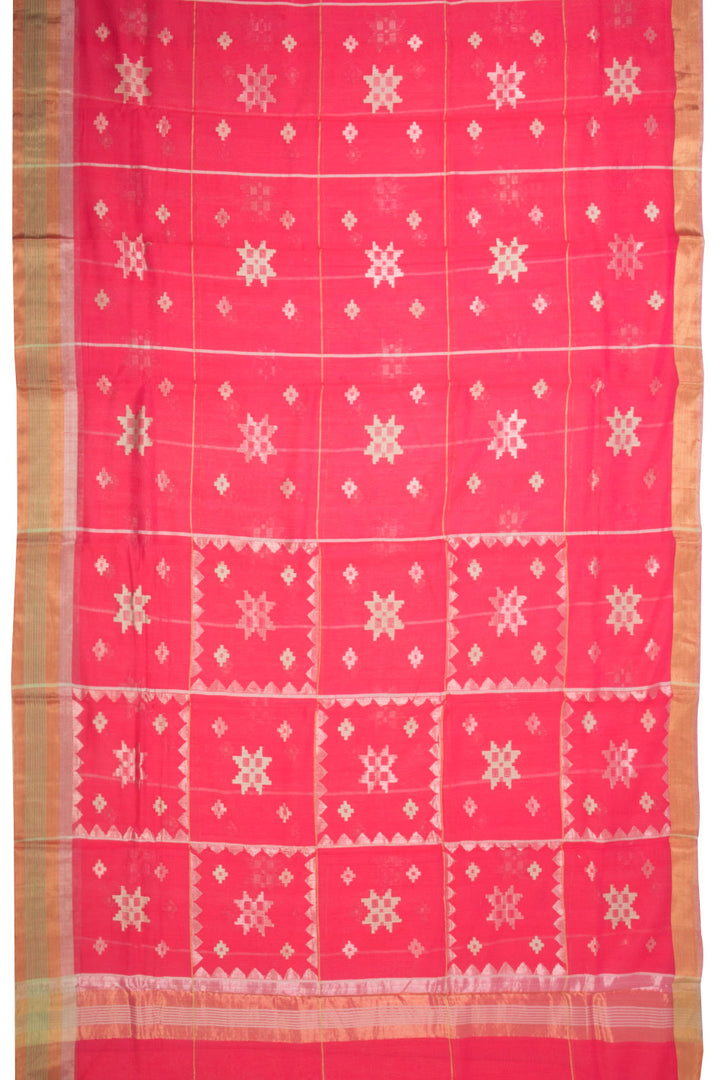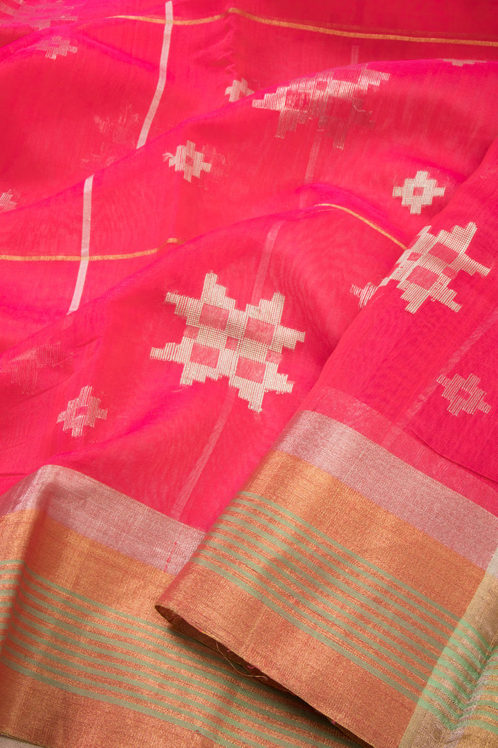 Indulge in sophistication with our Pink Handwoven Chanderi Silk Cotton Saree, ideal for any event. Made from premium silk cotton using traditional weaving methods that have withstood the test of time, this saree is not only long-lasting but also intricately adorned with geometric motifs throughout, particularly on the pallu in a checkered design. Exude confidence and comfort while elevating your fashion sense, as this saree beautifully showcases the intricacies of handwoven Chanderi fabric and its charming embellishments.