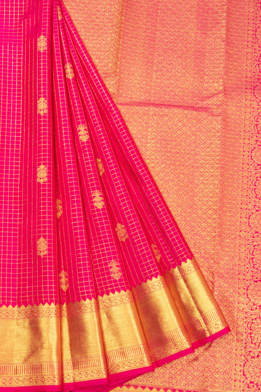 Introducing our elegant Pink Kanjivaram Silk Saree, featuring delicate floral motifs. Made from high-quality silk, this saree will drape beautifully and make you stand out in any occasion. Elevate your wardrobe with this timeless piece that exudes grace and femininity.