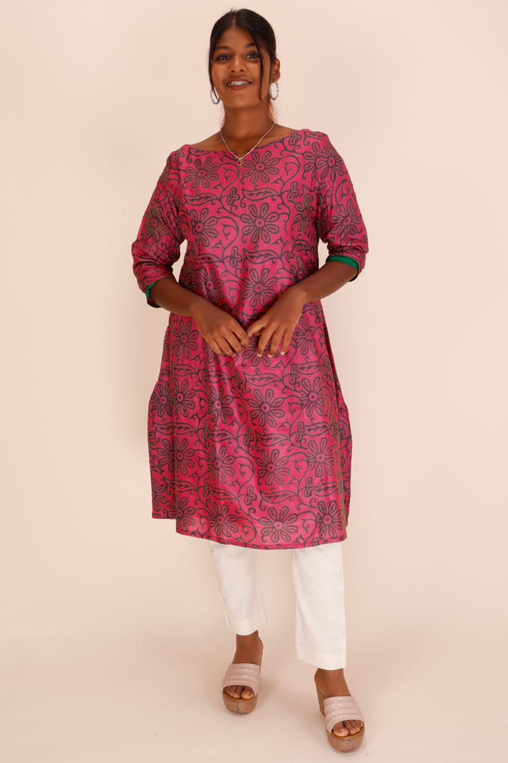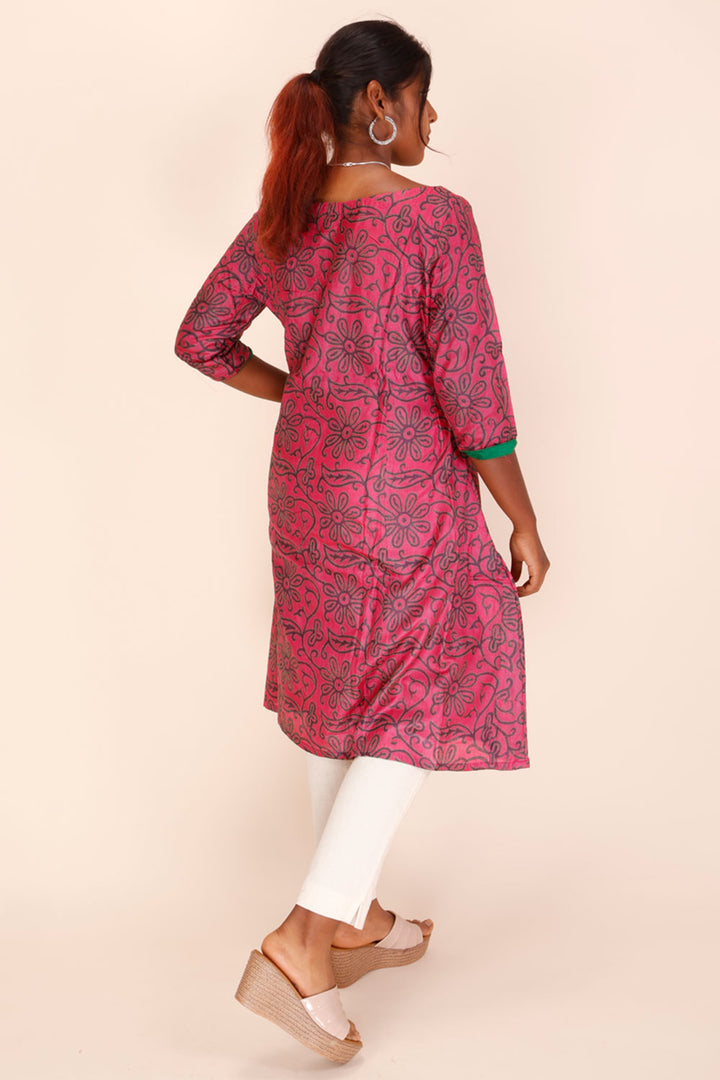 Elevate your ethnic wardrobe with this Pink Kantha Embroidered Tussar Silk Kurta. Crafted from luxurious tussar silk, it offers a rich texture and comfortable drape. The intricate Kantha embroidery adds timeless elegance, making it perfect for festive occasions or casual gatherings. Experience a blend of tradition and style that ensures you stand out effortlessly.