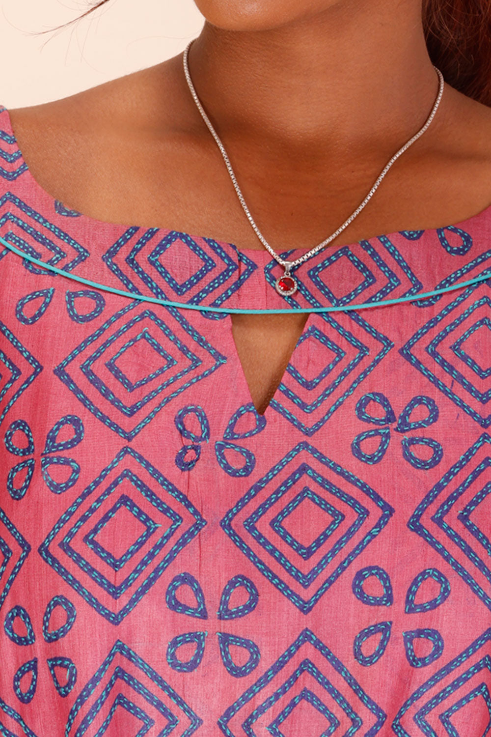 Elevate your ethnic wardrobe with this Pink Kantha Embroidered Tussar Silk Kurta. Crafted from luxurious tussar silk, it offers a rich texture and comfortable drape. The intricate Kantha embroidery adds timeless elegance, making it perfect for festive occasions or casual gatherings. Experience a blend of tradition and style that ensures you stand out effortlessly.