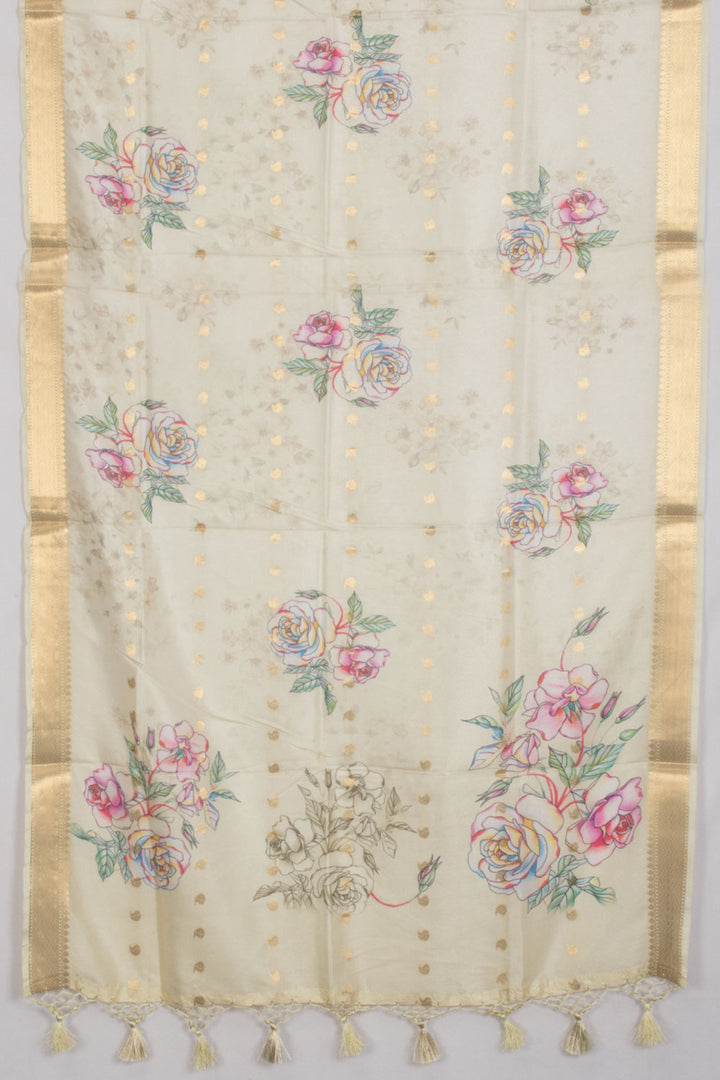This stunning Elachi Green Banarasi Silk 3 Pc Salwar Suit Material features intricate zari floral buttis on the top, paired with a matching pant and a beautifully printed dupatta adorned with zari edgings. Elevate your wardrobe with this elegant and versatile set!