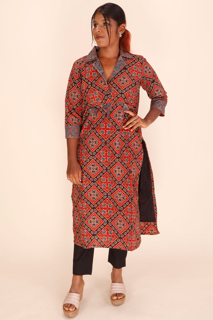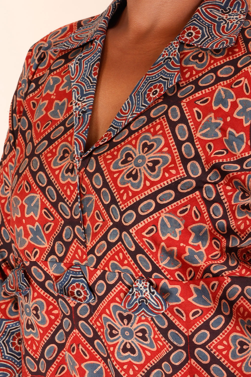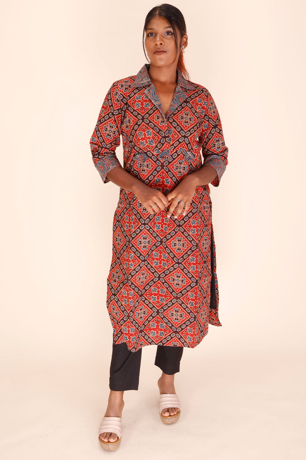 This stunning Red Ajrakh Printed Kurta features a sleek Shirt Collar Neckline in Blue Ajrakh. The Blue Patchwork acts as a bold sleeve embellishment, adding a touch of sophistication to the overall design.