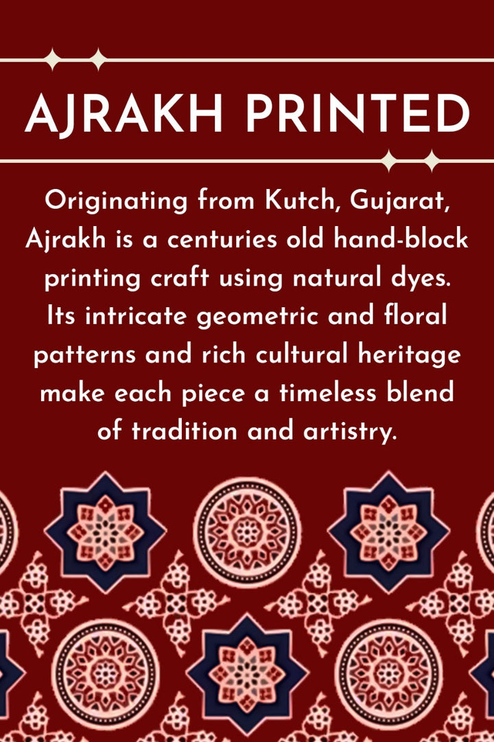 Ajrakh Printing is one of India’s oldest and most intricate block-printing traditions, flourishing in the Kutch region of Gujarat. Evidence of Ajrakh-like patterns has even been found in the ancient ruins of Mohenjo Daro and Harappa. The process is painstaking and time-intensive, with each colour printed separately, followed by cycles of drying, washing, and reprinting. This meticulous technique not only creates Ajrakh’s signature geometric and floral patterns but also makes the fabric exceptionally soft and long-lasting. Crafted entirely with natural dyes, Ajrakh prints have a rich, earthy aesthetic and vibrant depth of colour. These timeless designs are printed on fabrics like cotton, silk-cotton, modal, gajji, and more, celebrating centuries of skilled artistry.