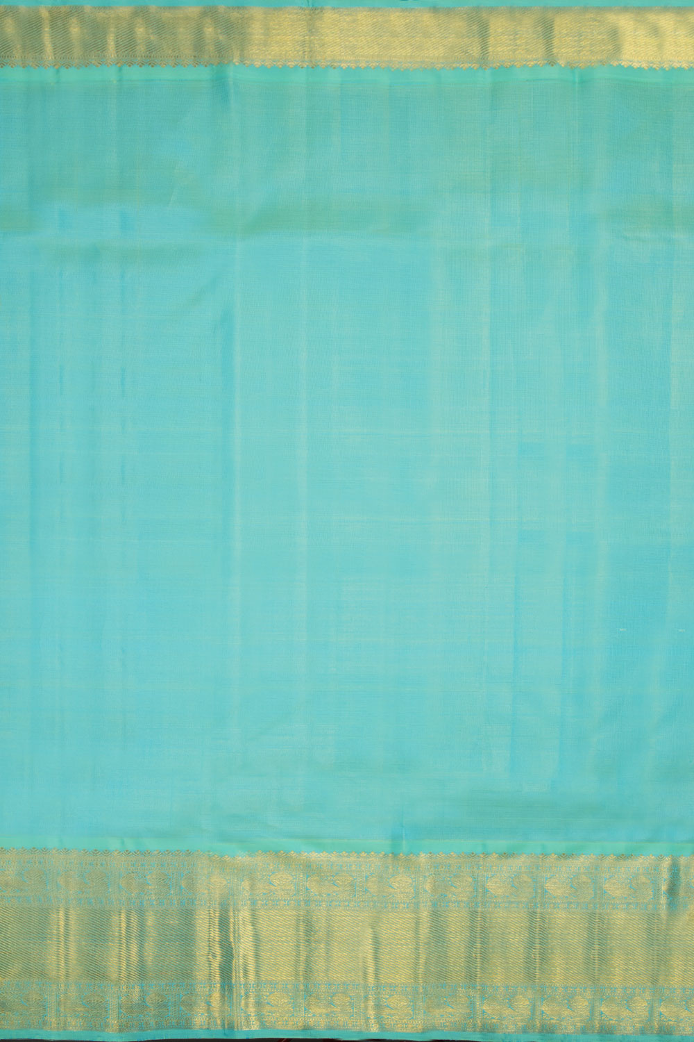 This Gorgeous Bridal Korvai Kanjivaram Silk Saree is detailed with Iruthalaipakshi Motifs and delicate zari vertical stripes throughout the fabric. The Powder Blue Korvai Border features peacock motifs and stunning Yazhi and Arai Maadam designs on the pallu. Included is a contrasting blouse to complete the ensemble.