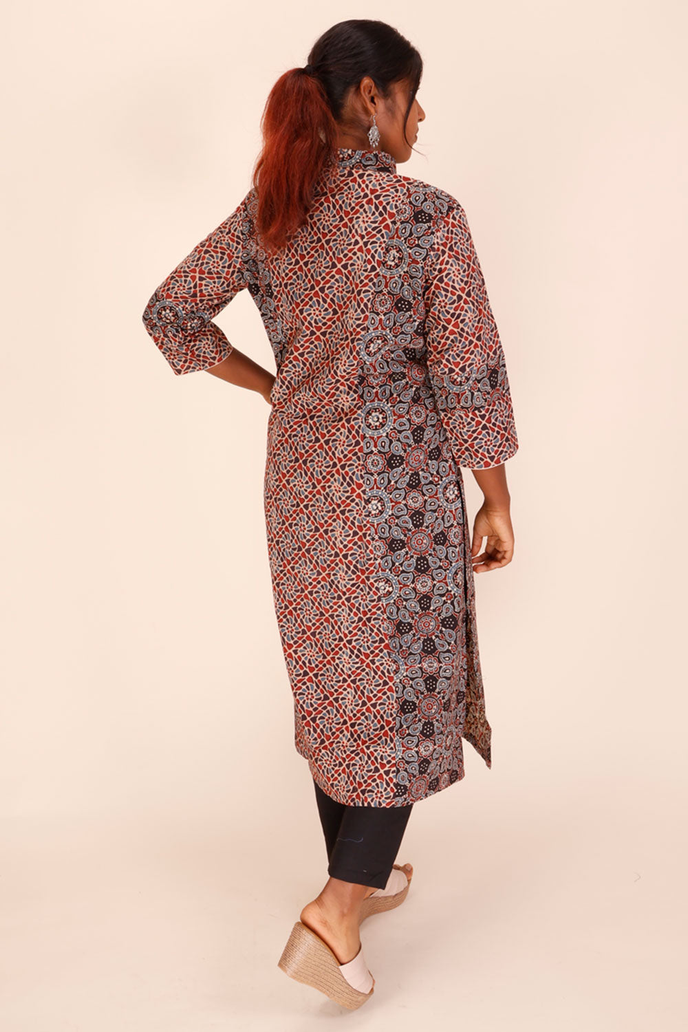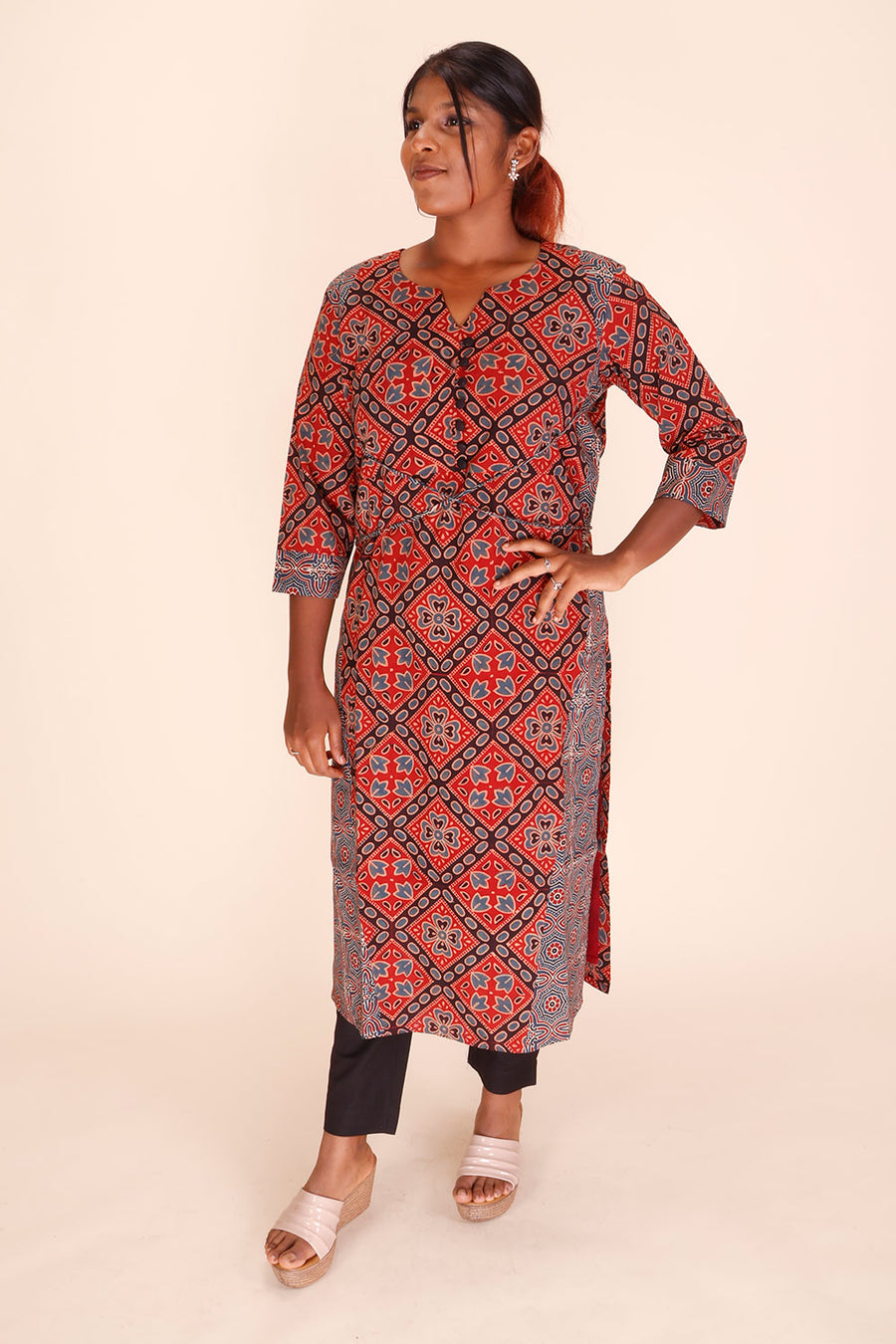 Experience the rich heritage of Ajrakh with our Red Ajrakh Printed Cotton Kurta! Hand-crafted with intricate prints, this kurta is made from high-quality cotton for a comfortable and stylish fit. Elevate your wardrobe with this...