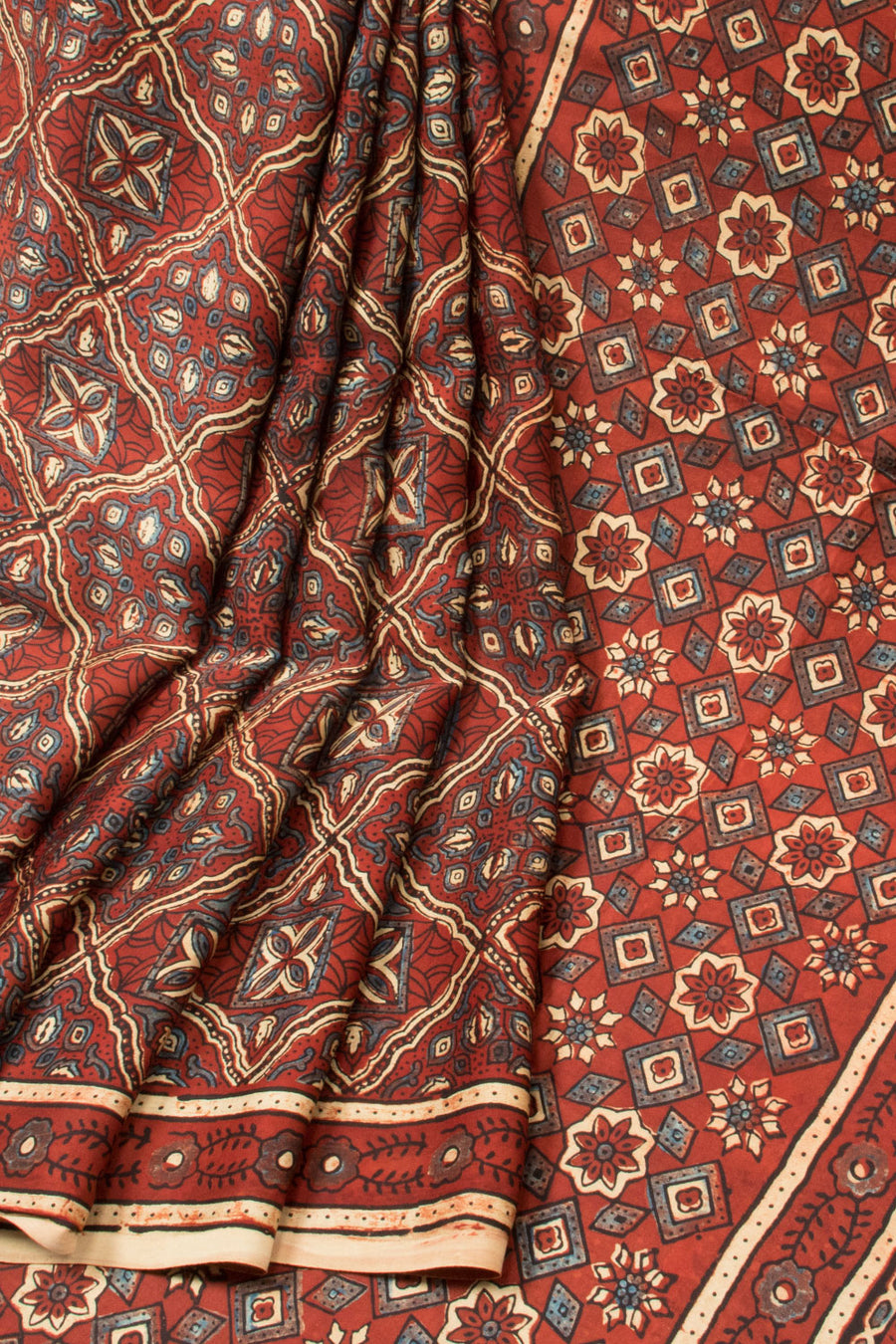 Experience the elegance and grace of the Cream Ajrakh Printed Cotton Saree 10072169. Featuring a subtle cream hue, this saree boasts an abstract cotton print with bold brushstrokes in black and blue. The structured maroon ajrak...