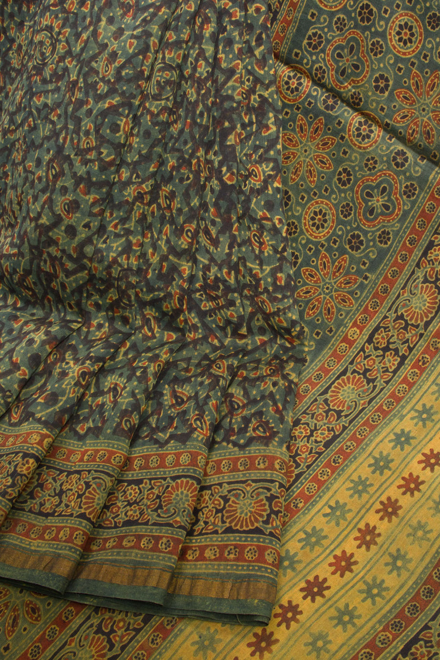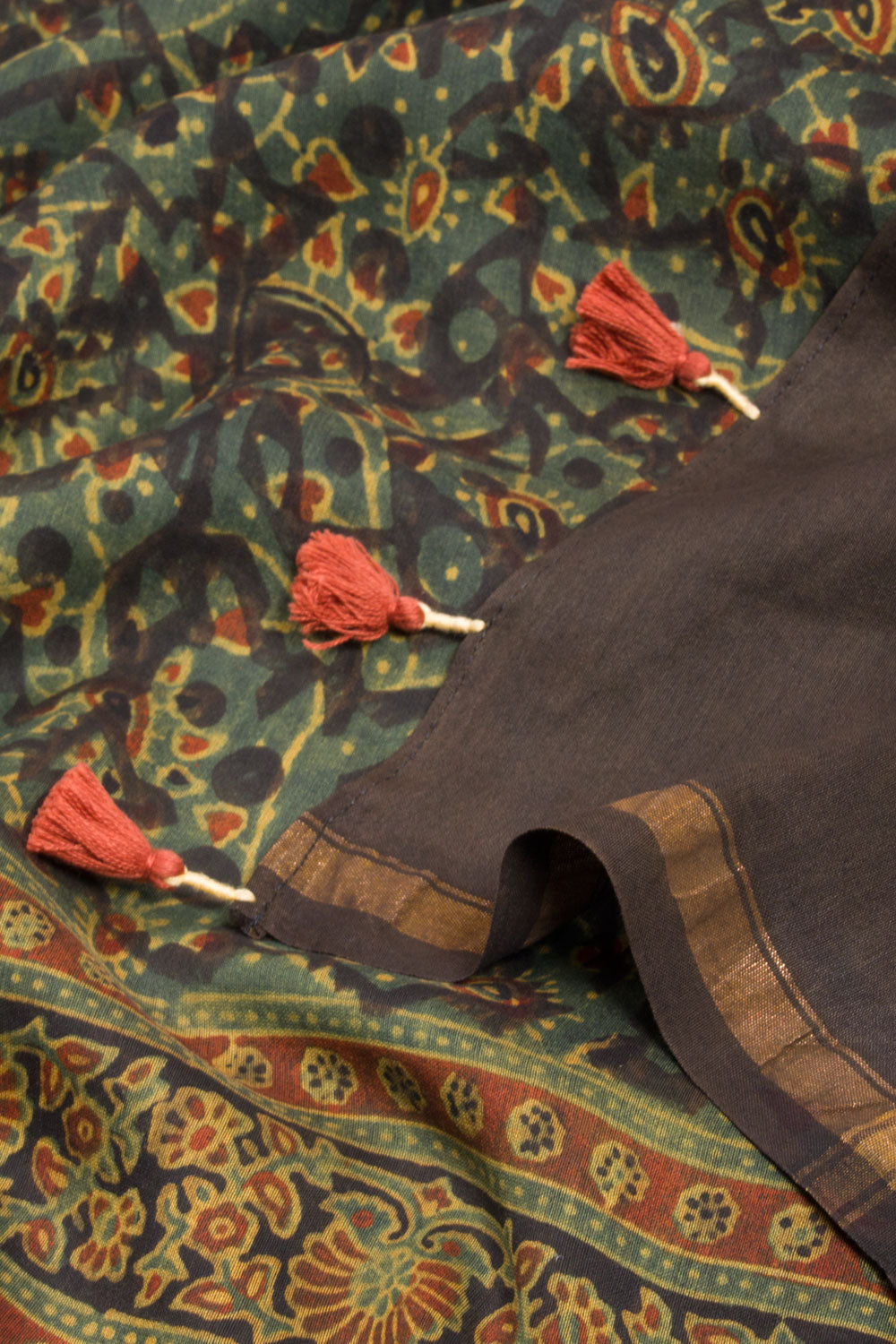Elevate your style and make a statement at any occasion with this stunning Green Ajrakh printed silk cotton saree. Adorned with beautiful floral motifs entire saree blouse and pretty tassels on the pallu, this exquisite piece w...