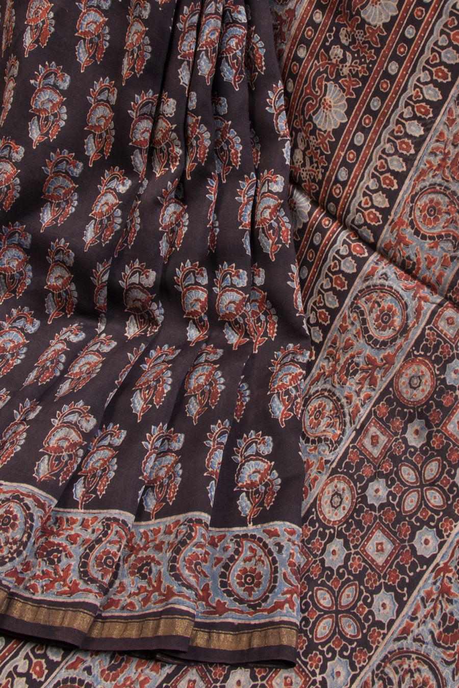 Indulge in the perfect addition to your wardrobe with the Black Ajrakh Printed Silk Cotton Saree, featuring stunning Hand Block prints with Floral Motifs entire Saree and Blouse a beautiful, unique Ajrakh pattern. The Floral pr...