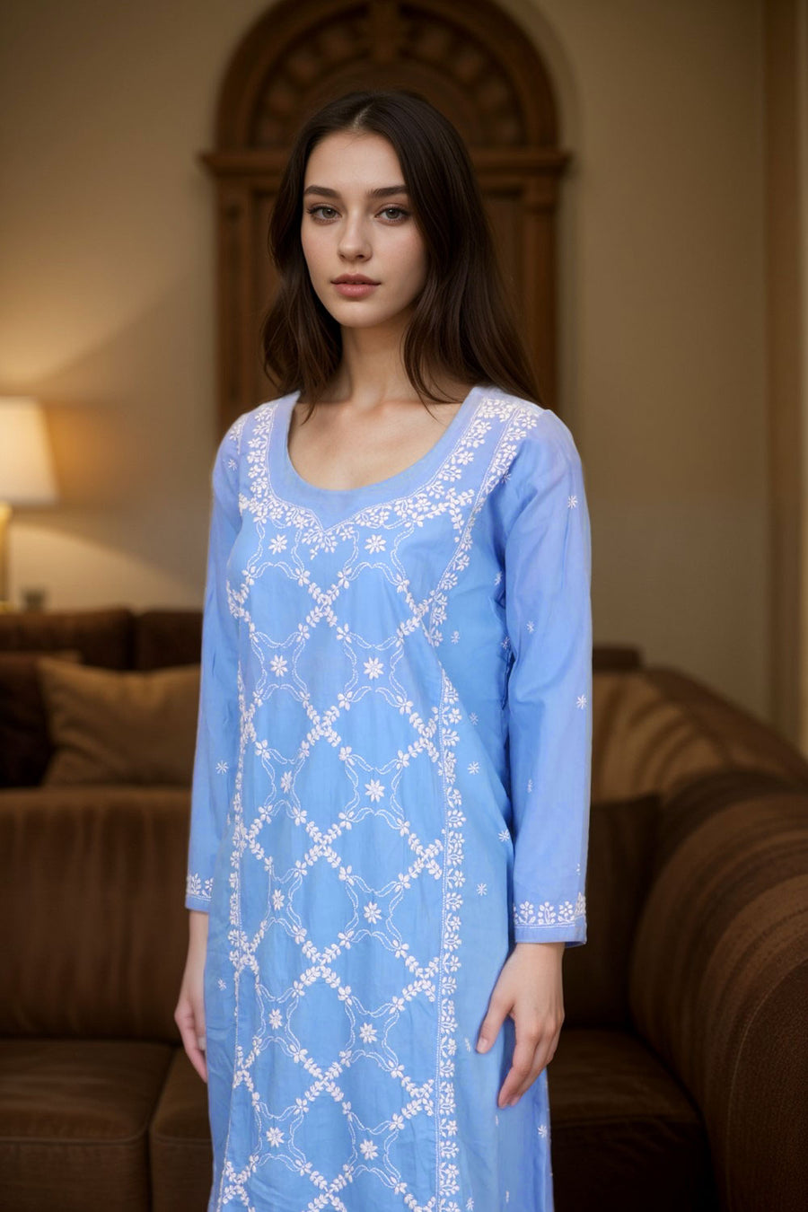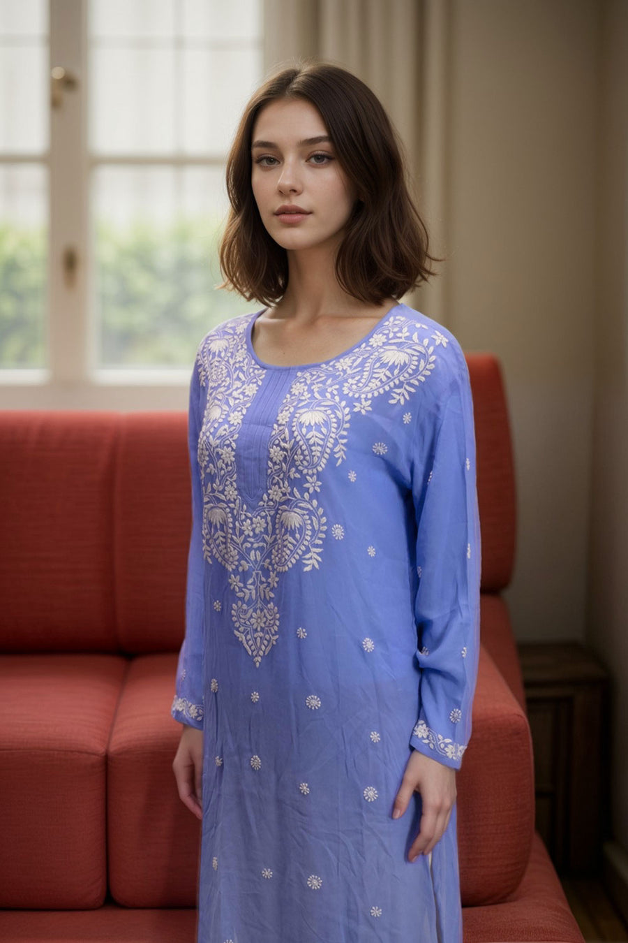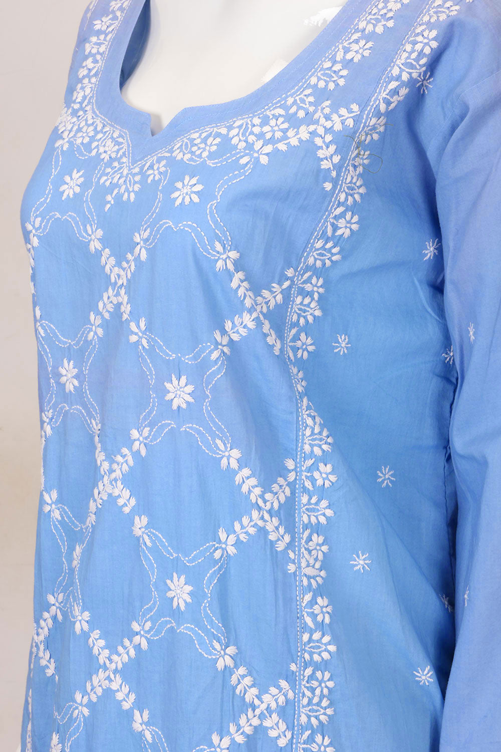 Elevate your ethnic wardrobe with this Blue Chikankari Embroidery Georgette Kurta. Crafted from lightweight georgette fabric, it offers a graceful drape and all-day comfort. The intricate chikankari embroidery adds timeless ele...